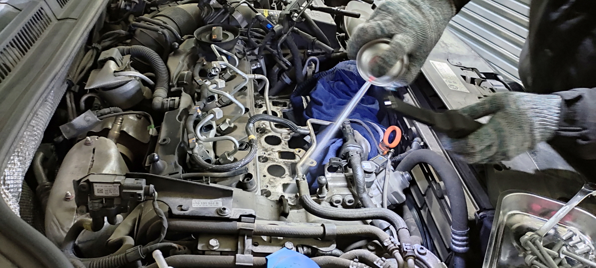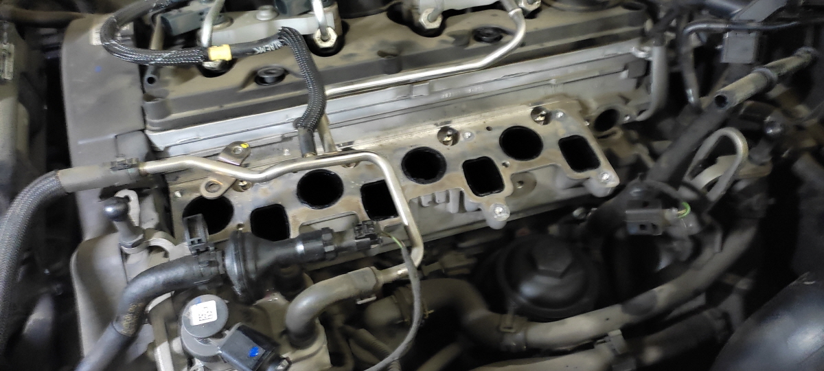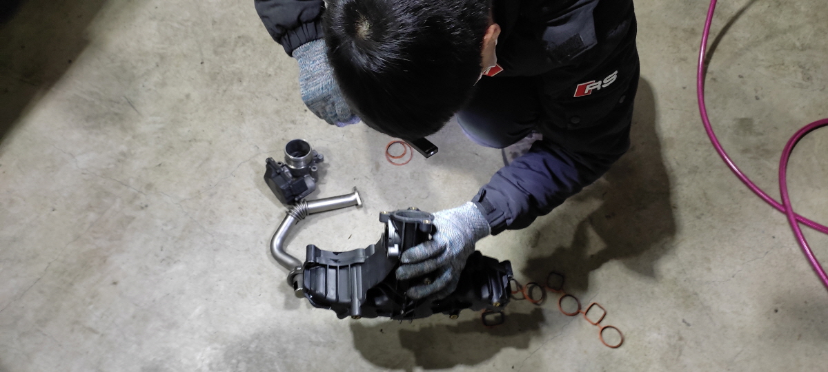 디젤 차량의 경우, 공기+연료+열 이 세가지만 있으면 실린더 내에서 폭발(연소)을 일으킬 수 있습니다. 그렇다면, 불꽃 점화 방식의 가솔린 차량보다 공기와 연료에 신경 써야 하는 게 사실입니다. 그중 공기가 연소실로 보내지기 위해서는 이 흡기 다기관을 거쳐야 하는데, 이 부위를 때마다 청소를 해주어 공기의 유입을 원활하게 해 주기 위한 정비입니다.