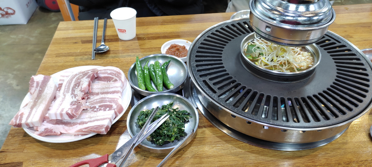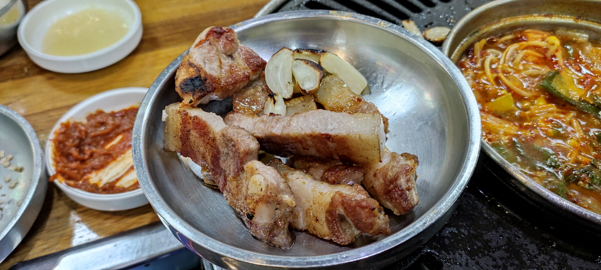 삼겹살이 부판에 올라가니 부판의 사이즈가 기억난다. 삼겹살의 조각들이 그리 작은 사이즈가 아님에도 총 4개의 삼겹살이 올라간다.