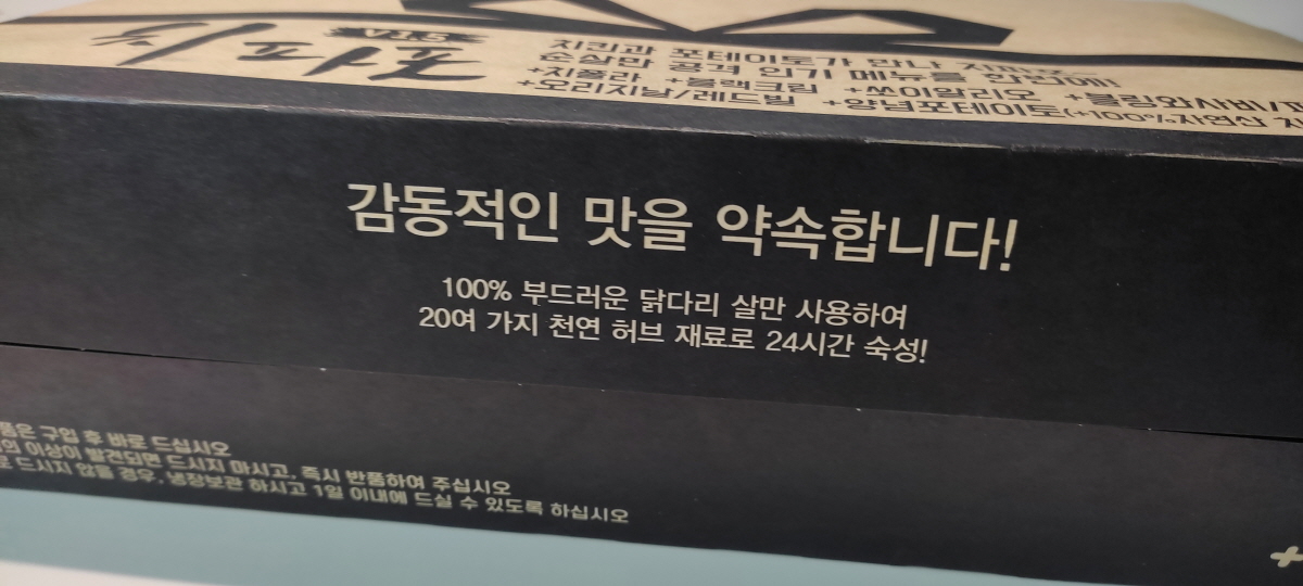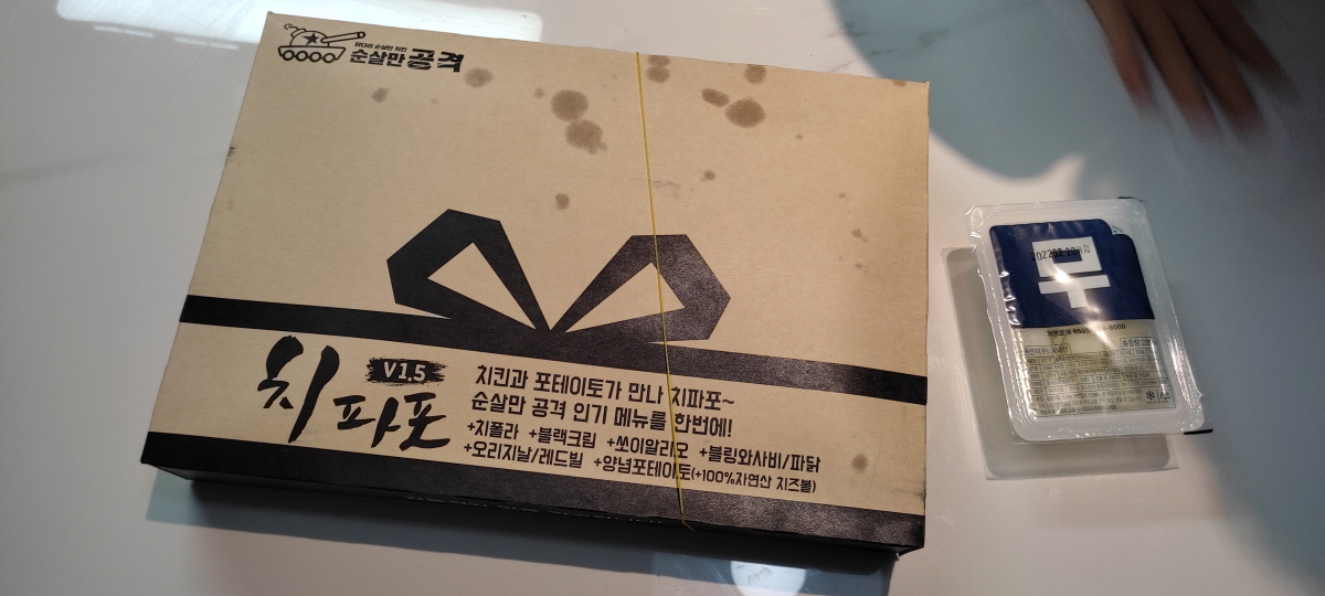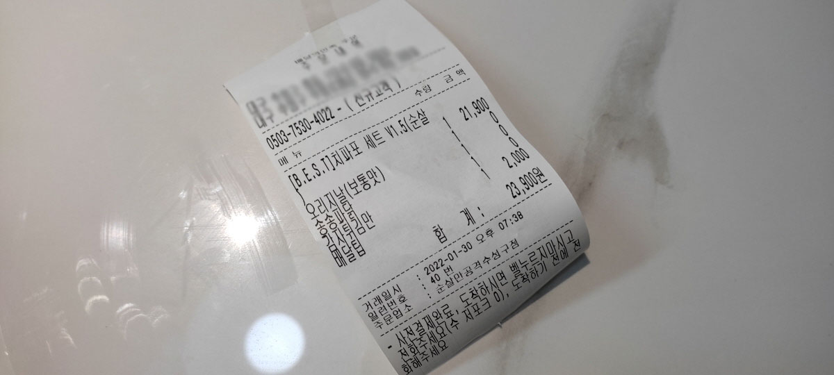 요즘 참 광고들이 많다. 그래서 내돈내산이란 걸 알리기 위해 영수증을 올려본다. 영수증에서도 알 수 있듯이 2022-1-30일 주문해서 순살만 공격 치파포 V1.5세트를 먹어보았다. 여기서 V1.5는 한 마리 반이라는 것이고 V2.0은 두마리가 되겠다.