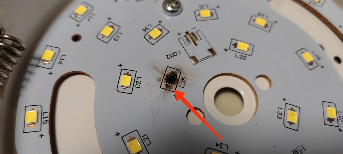 자세히 보면 기판에 달려있는 led하나가 탄 흔적을 확인할 수 있다.