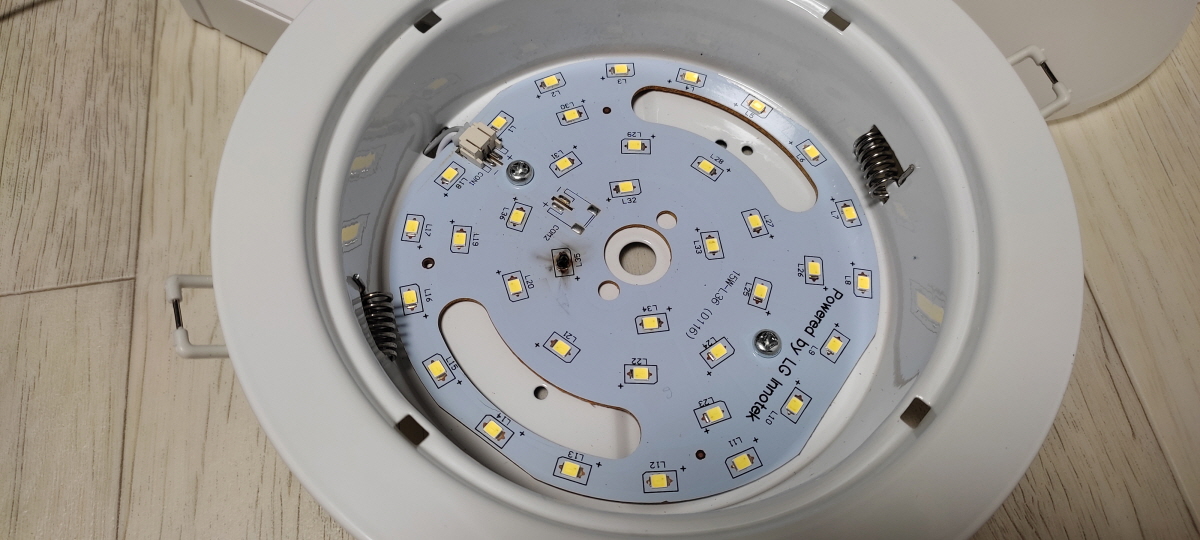 일단 led매립등 안전기에는 문제가 없는듯하니 led 기판을 확인하고자 led매립등 보호판을 제거하니 문제가 된 이유를 알 수가 있었다.