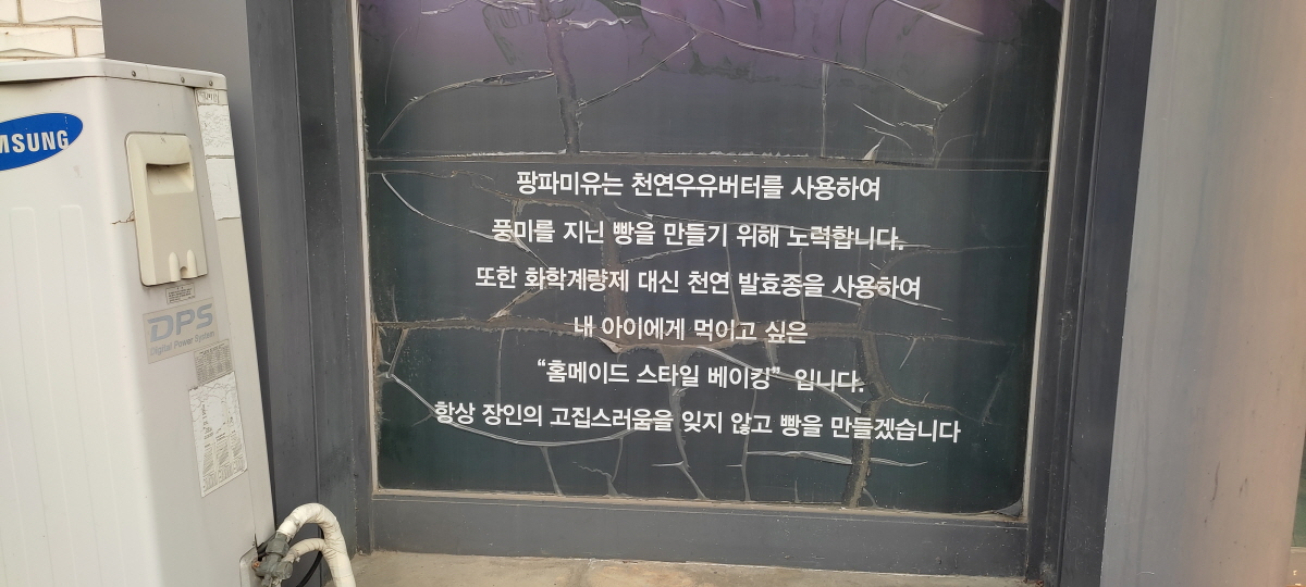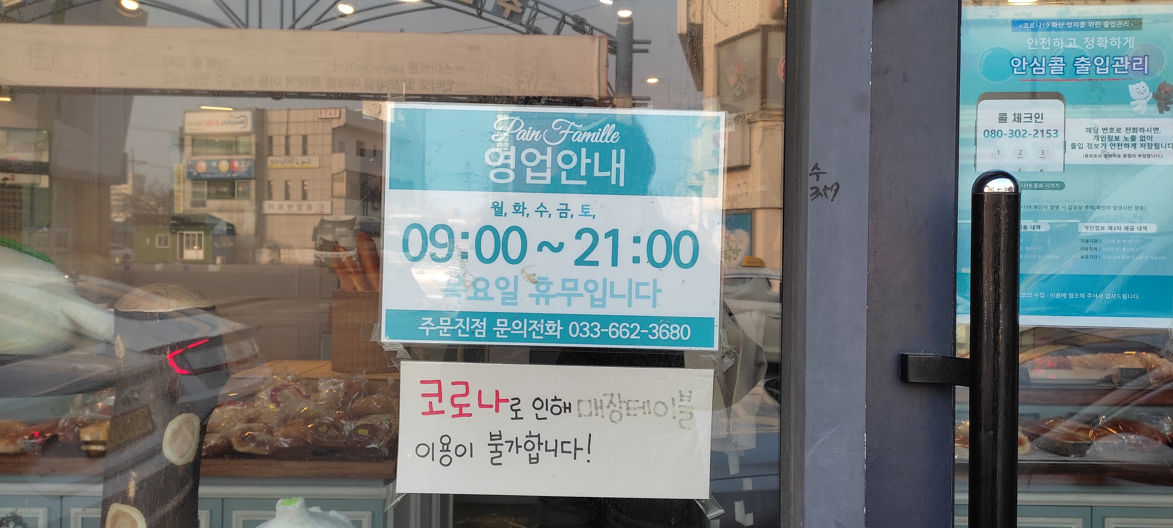 입구에서 확인되는 팡파미유 영업시간, 목요일은 휴무이고 아래의 연락처가 있으니 마늘빵 나오는 시간부터 확인하고 그 시간에 맞게 도착하면 진정한 마늘빵의 맛을 느낄 수 있을 것이다.