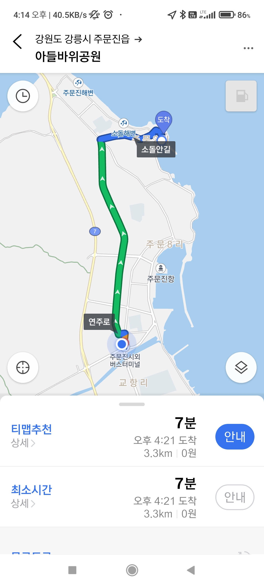 아들 초등학교 졸업기념 강원도 강릉 여행 2박 3일 일정이 이렇게 빡빡하게 다녀왔는지 글을 포스팅하면서 알게 된다. 물론 이 글이 나중에는 추억이 되겠지만... 지금은 필자에게 고통?이다. 지난번 생활의 달인에 출연해서 마늘빵으로 유명해진 팡파미유 빵집을 거쳐 아들바위로 가본다. 팡파미유에서 아들바위까지의 거리는 아래의 티맵 정보를 확인하면 좋겠다.