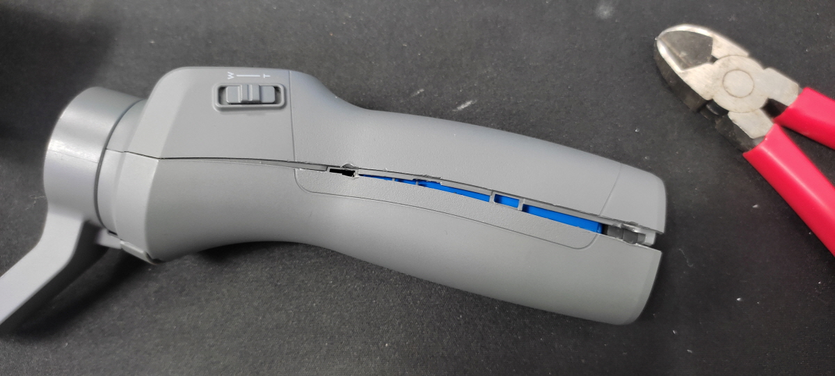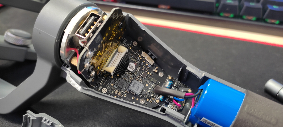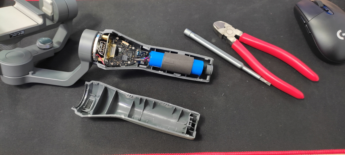 오즈모 모바일 2 손잡이 분리에 생각보다 많은 시간이 소요되었다. 하지만 분리해보니 예상한 대로 배터리가 손잡이에 있어 다행이다. 당연한 이야기이다.