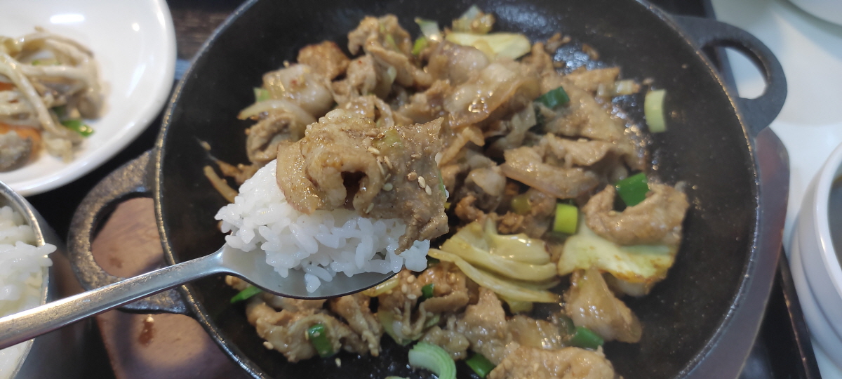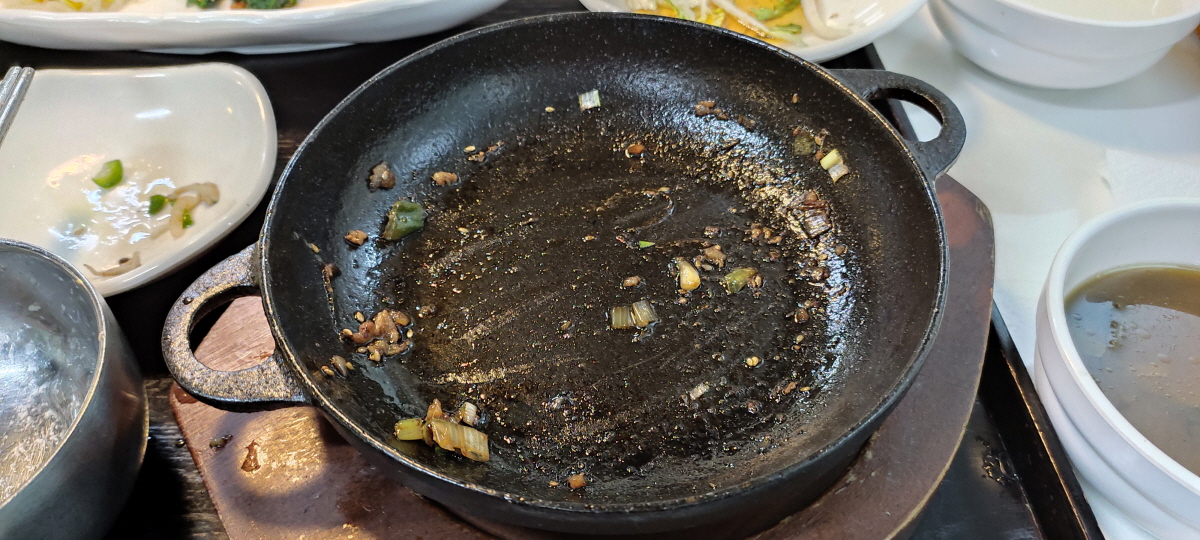 간장 불고기는 무쇠에다 조리되어 나오는데 다~ 먹을때까지 온기가 남아있어 간장불고기 맛을 더욱 살려준다. 그리고 무엇보다 바닥에 눌어붙은 돼지고기는 약간의 불맛? 탄맛? 까지 느낄 수 있어 더욱 좋았다.