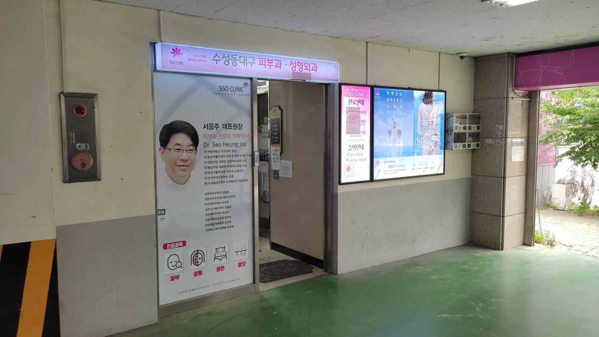 수성동대구피부과의원 건물은 총 5층까지 운영 중이며 2층 피부관리실, 3층 외래진료, 4층 레이저/쁘띠성형 그리고 1층은 약국이다.