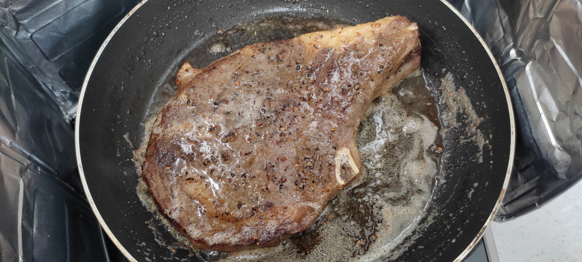 들어간 버터가 모두 녹았다고 보이면 숟가락으로 프라이팬을 살짝 기울여 버터 국물을 들어 토마호크에 한 숟가락씩 계속 올려줍니다. 이때도 불 조절은 필수이며 절대~ 센 불은 안됩니다. 버터와 고기가 타들어가는 걸 볼 수 있을 겁니다.