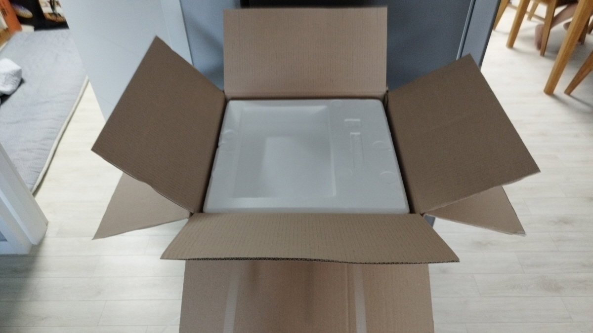 스티로폼을 제거하면 안전하게 파세코 창문형 에어컨과 에어컨 거치대가 들어가 있는 걸 확인할 수 있습니다.