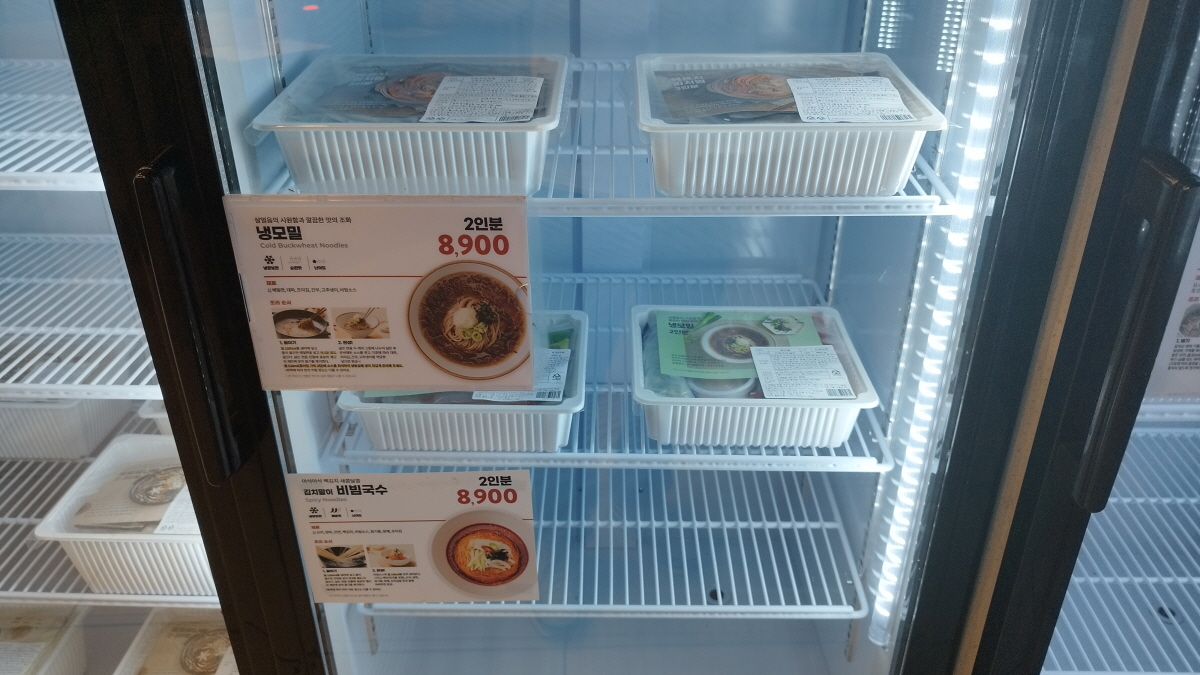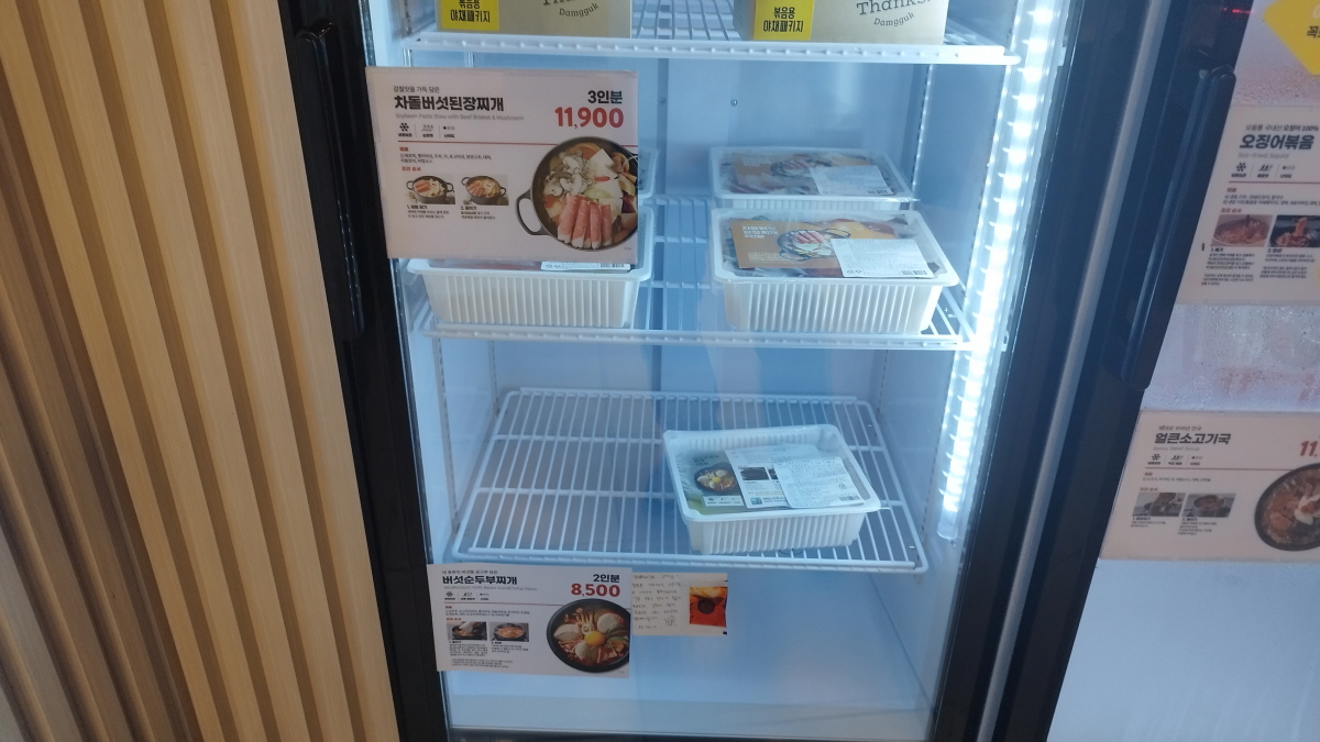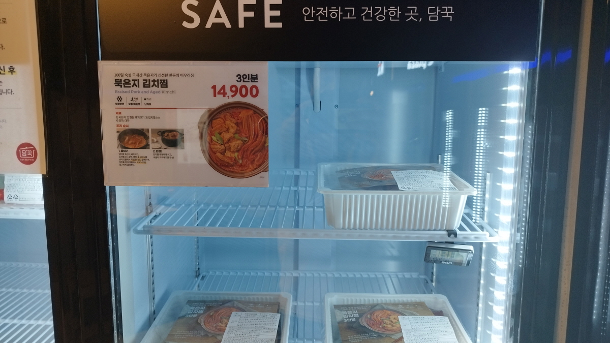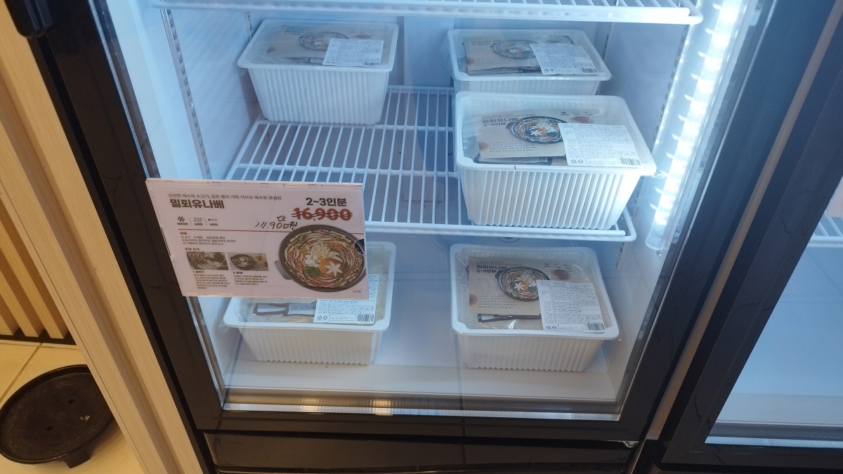 입구에서 가장 가까운 밀키트 냉장고부터 소개하겠다. 제일 먼저 보이는 담꾹 메뉴는 바로 밀푀유나베이다. 가격이 16,900원에서 14,900원으로 할인 판매하고 있는 듯하다. 2~3인분에 이 가격이면 가성비가 있어 보인다.