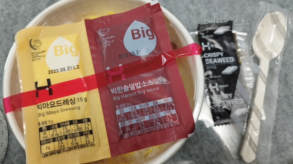 제공되는 소스류는 빅마요드레싱 15g, 빅한솥덮밥소스 35g과 조미김 1g