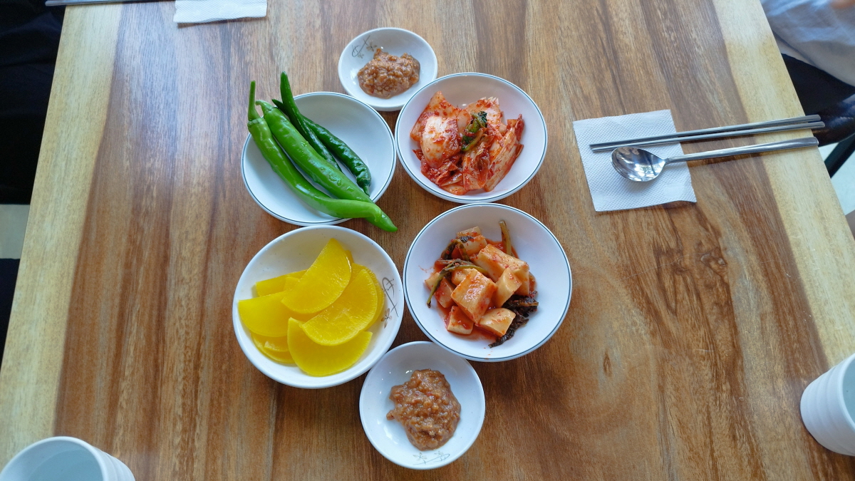 주문한 메뉴들이 다양해서인지 기본 찬들도 다양해 보인다. 대부분의 국숫집은 생고추와 김치 그리고 된장이 끝인데... 만두를 주문해서인지 단무지와 깍두기까지 기본찬으로 나온다.