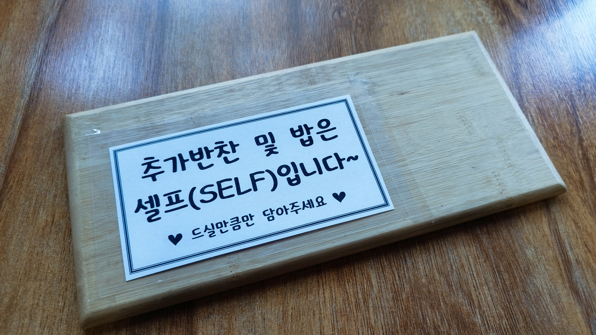 주문 후 확인한 추가반찬 및 밥은 셀프라는 문구, 가격은 올랐지만 서비스에 대한 부분은 아주 부족한 느낌이 든다. 물론 인건비 부분도 포함되어 가격이 상승한 이유가 아닌듯하다. 그럼 원재료값으로만 상승했다면 뭔가 분명 잘못된 가격 인상이 아닌가 생각해 본다.