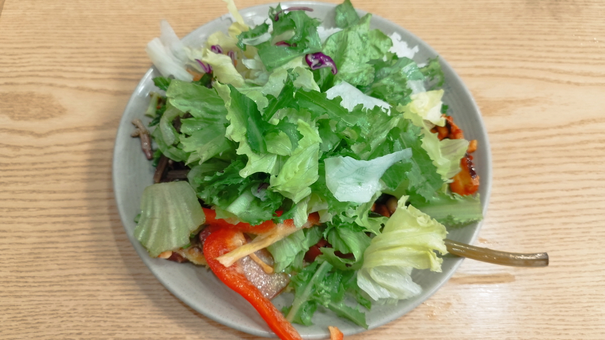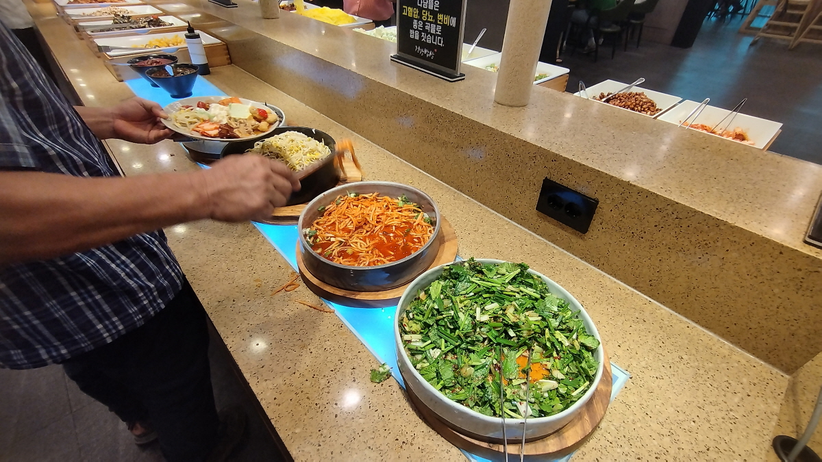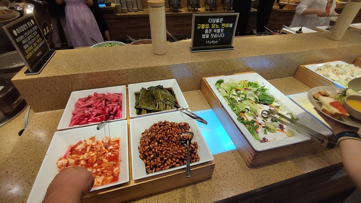 필자는 뷔페라는 장점을 확실하게? 이용하기 위해 이번에는 샐러드만 가져오지 않았습니다. 샐러드 아래에 밥과 다양한 한식 반찬들이 깔려 있습니다.