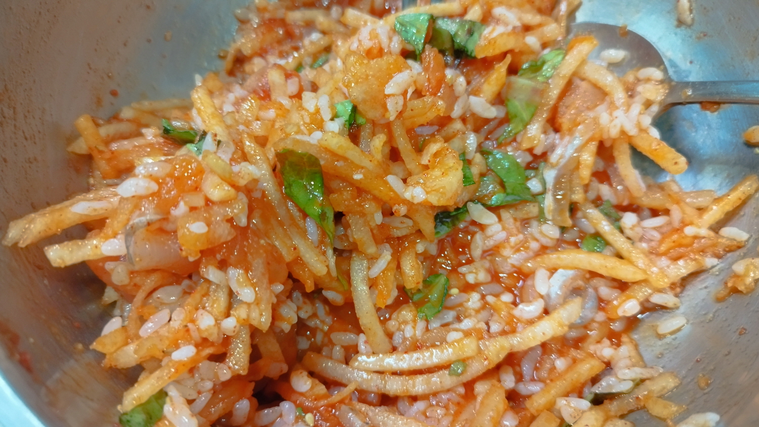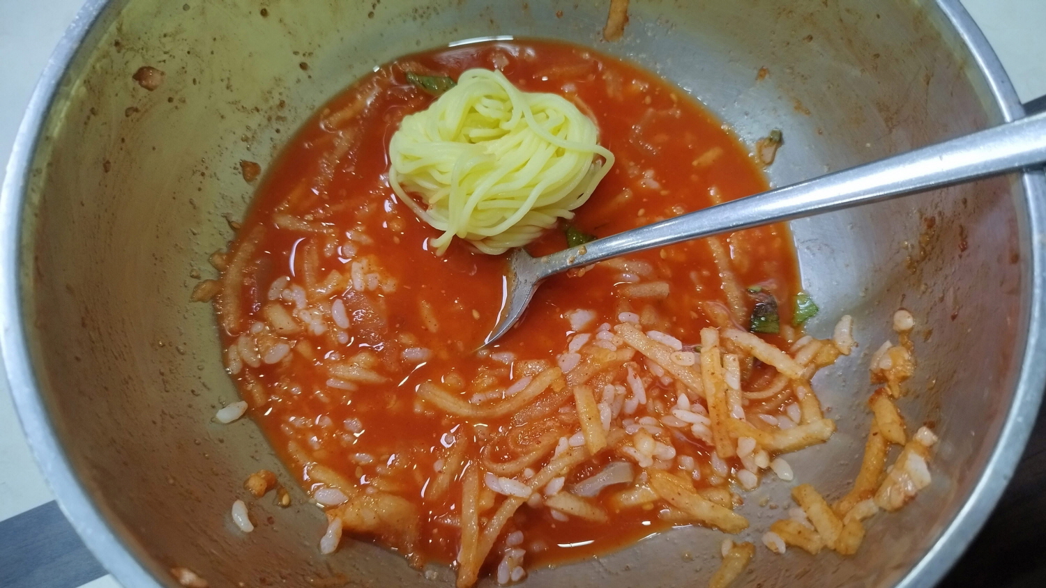 밥을 먹어 함께 비벼먹는다. 밥이 들어가니 살짝 싱거운 맛도 난다면 그땐 제공되는 육수를 조금씩 넣어가면서 먹어본다.