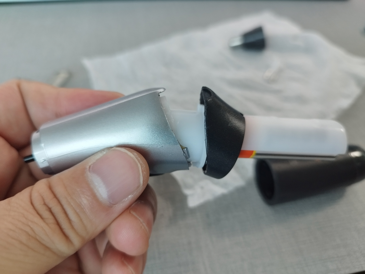 직장 여동료에게 부탁하니 단번에 아래의 사진처럼 마무리해 주었다. 연결된 모습 보고 있는데 스위치 쪽에서 어떻게 분리가 되었는지 이유가 궁금했다. 그리고 분리된 부품이 없어도 작동에는 아무런 문제가 없다. 분리된 부품의 역할은 스위치 상하작용에 있어 좀 더 꽉? 잡고 있는 느낌만 줄 뿐이다.