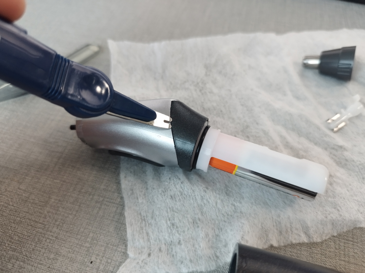 미작동 확인 후 건전지는 물론 코털제거기의 연결 부분을 모두 분리한다. 아래의 사진을 보면 알겠지만 어떤 도구를 이용하지 않는다면 여기까지가 분리의 끝일 것이다.