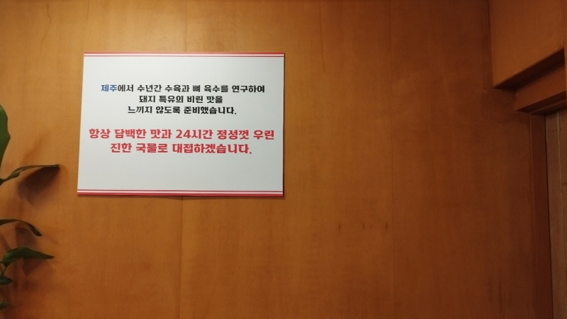 화장실 입구 안내판, 제주에서 수년간 수육과 뼈 육수를 연구하여 돼지 특유의 비린 맛을 느끼지 않도록 준비했습니다.