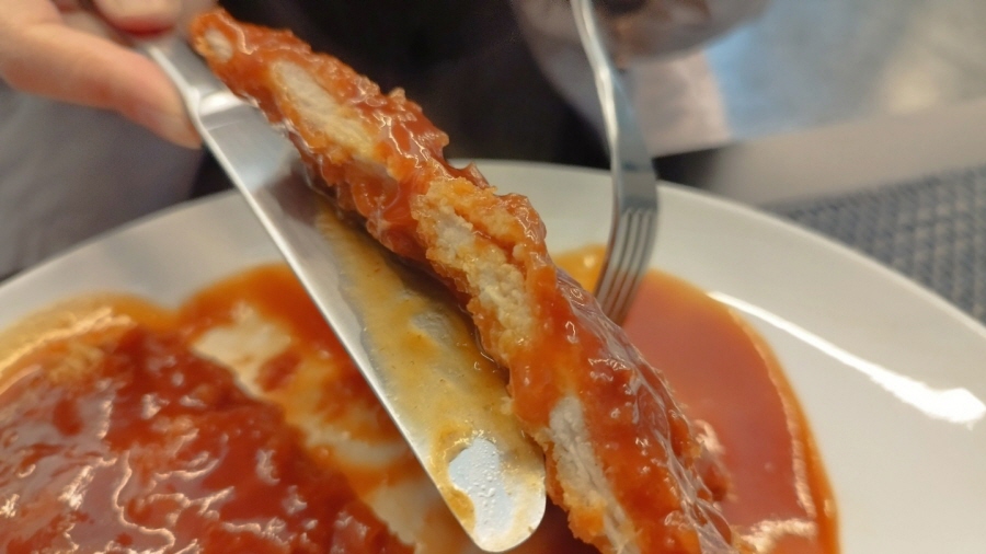 돈가스의 두께는 그만그만하다. 두껍지는 않지만 소스와의 궁합이 너무 잘 맞고 잘 배겨있다.