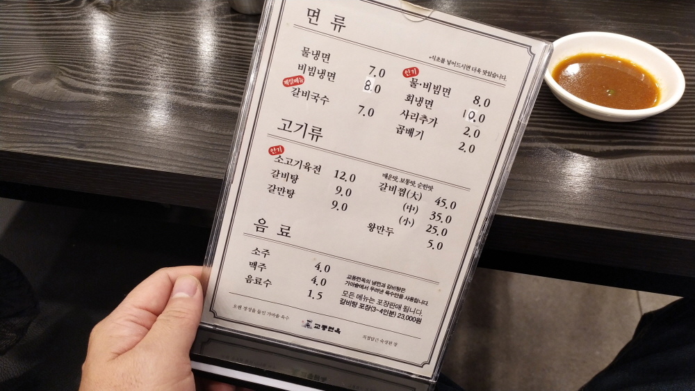 이 글을 작성하면서 메뉴판을 다시 확인해봅니다. 사실 사장님과 함께 먹는 점심이라 다른 메뉴를 주문하기 좀 그랬네요. 다들 대구 냉면 맛집으로 추천을 하는 집이라 물냉면이나 비빔냉면을 먹고 싶었지만 다음으로...