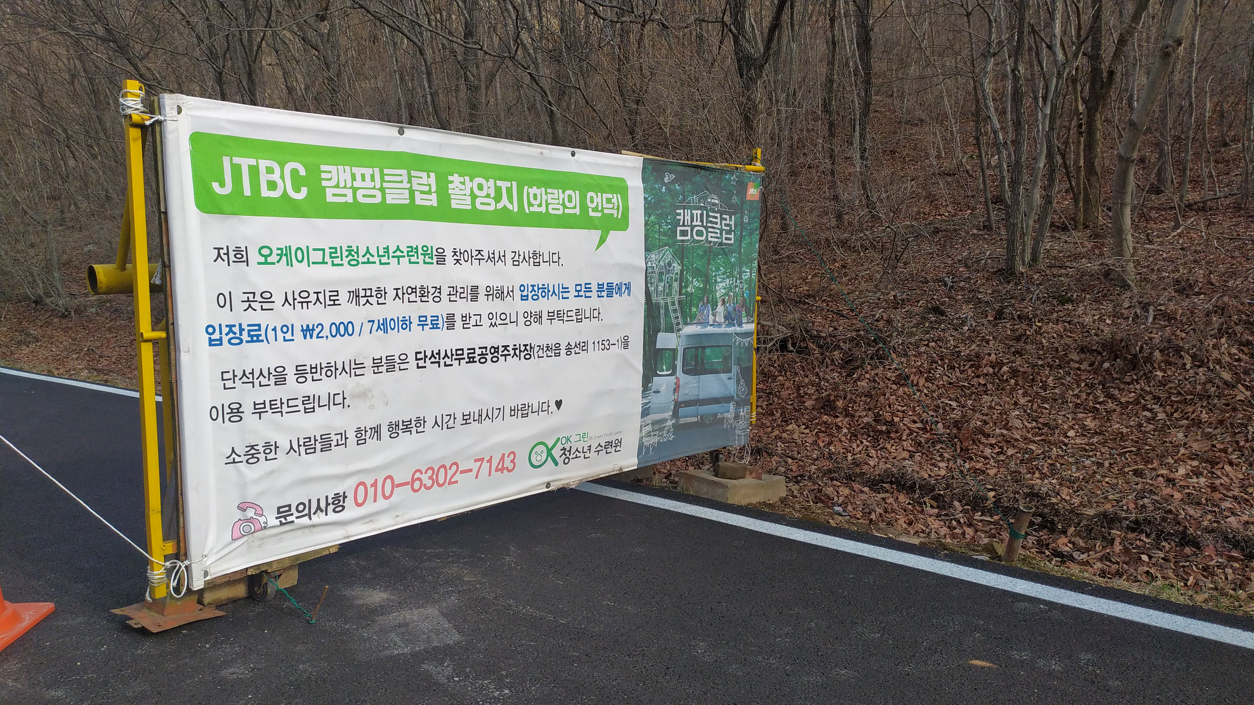 매표소 옆 현수막, 캠핑클럽 촬영지이며 오케이그린청소년수련원 안내문이 보인다.