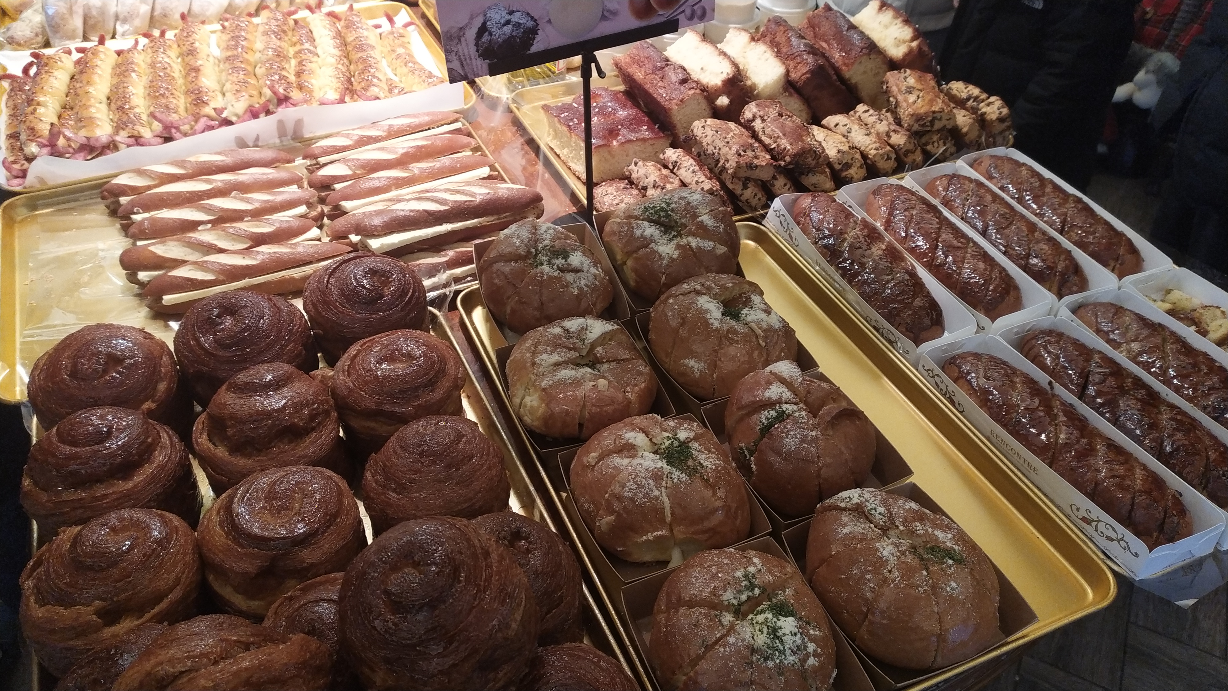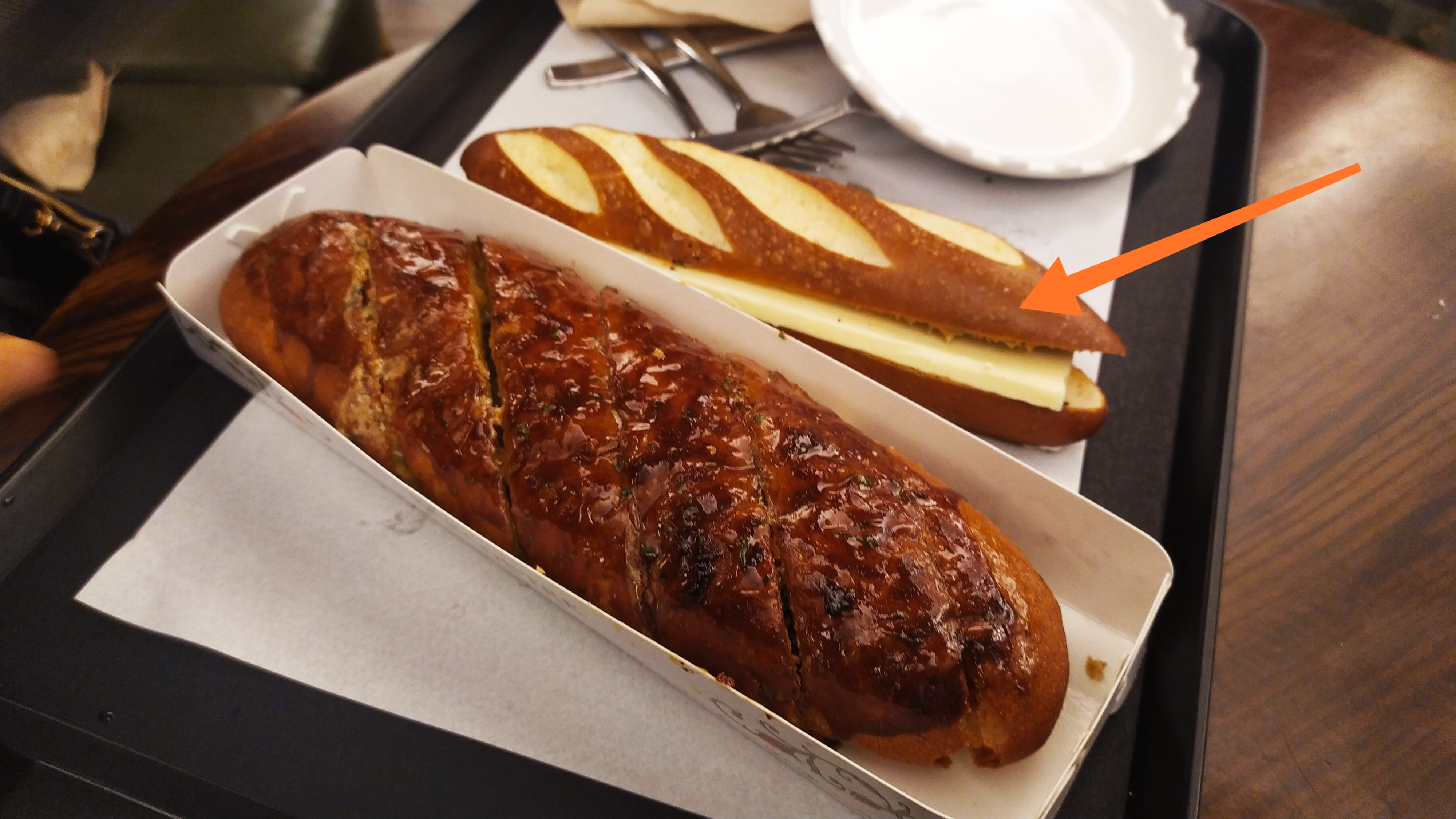 화살표로 표시한 빵이 이 가게에서 가장 인기가 많은 빵인데 먹어보면 이유를 알 수 있다. 개인적으로 꼭~ 먹어보길 바란다. 빵 안쪽에는 치즈가 들어가 있는데 빵과의 조화가 예술이다.