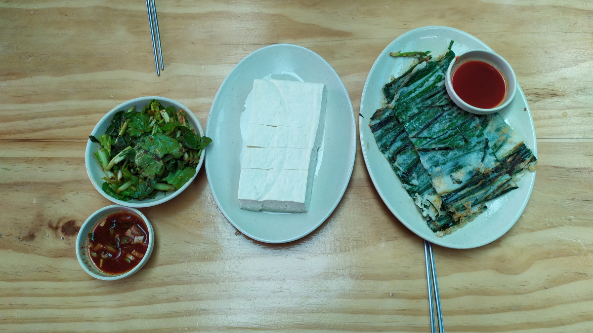 주문과 동시에 나온 촌두부, 부추전과 기본 메뉴