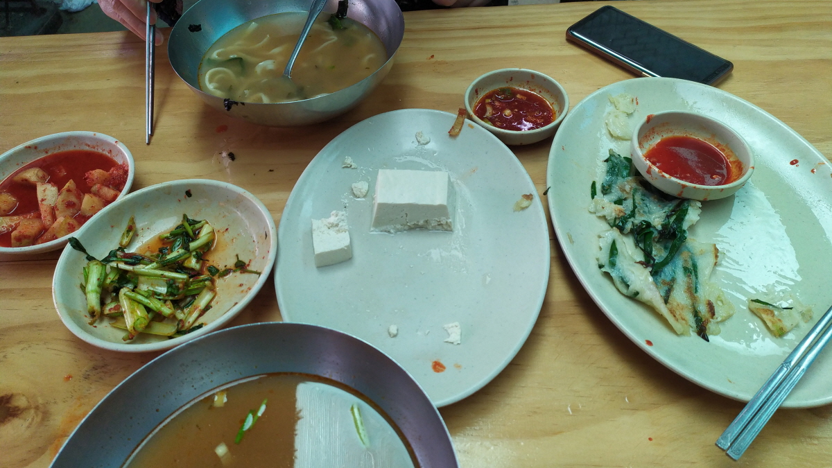 촌두부는 가성비도 있고 맛도 단백하여 나름 높은 점수를 주고 싶었다. 하지만 밀려오는 손님 탓인지 몰라도 너무 비위생적이다. 이유는 사진으로 보이는 두부 접시에도 또 다른 두부 접시를 올려 세팅을 하는 모습이 너무 싫었다. 그것도 주방에서 하는 것이 아니라 손님들이 다니는 홀에서 제조된 두부를 칼로 자르고 있는 모습이 당당하기까지 하다. 위생적인 부분만 충족되었다면 맛은 좋았다.