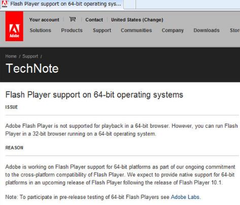 이 문제를 해결하기 위해 기존의 플러그인이 동작하는 32bit 버전 IE도 준비되어있는 셈이다. 예를 들어, Adobe의 「Flash Player 10」은 32bit 버전 밖에 준비되어 있지 않기에. 따라서 Flash가 사용된 웹 페이지를 보려면, 32bit 버전 IE가 필요하다는 것입니다.