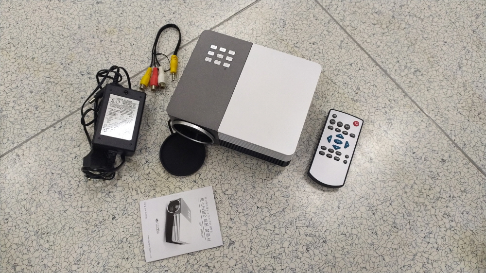 프로젝터 본체, 전원 케이블, 사용설명서, 무선 리모컨, 짧은 영상&음성 케이블 이렇게 구성되어있다.