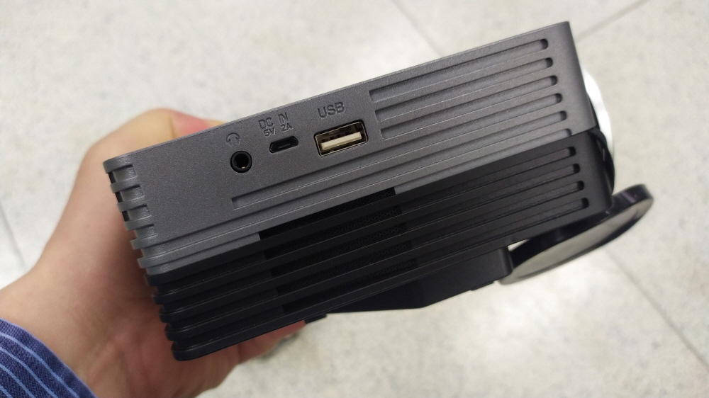 헤드폰단자(PIN), DC IN 5V 2A(일반적인 보조배터리로 전원 공급이 가능하다.), USB 단자(노트북 연결이 아니어도 외부 메모리카드로 영상을 플레이할 수 있다.)