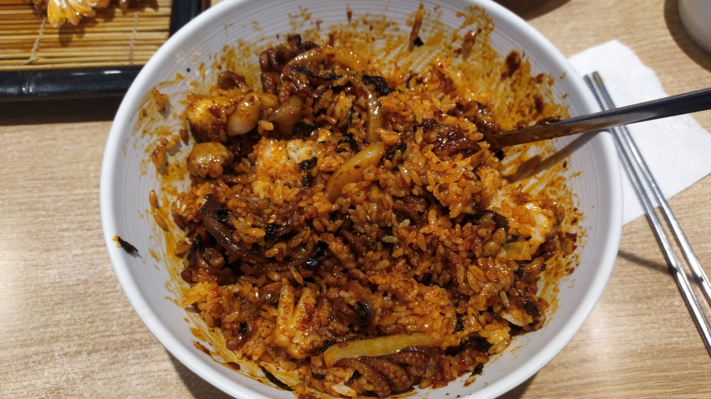 중간 정도의 매운맛을 나름 평가하고 밥과 함께 비벼보지만 쭈꾸미양이 너무 많았다. 그래서 밥 한 공기를 더 주문했는데 그래도 맵다. 정말 매운맛을 느끼고자 한다면 위 사진처럼 드시면 되지만 쭈꾸미의 불맛을 느끼고자 한다면 그냥 비벼 먹는 것은 비추이다. 그리고 쭈꾸미맛보단 고추기름의 불맛 아니 기름 맛과 향이 너무 강해서 살짝 느낀 한 맛도 있다.
