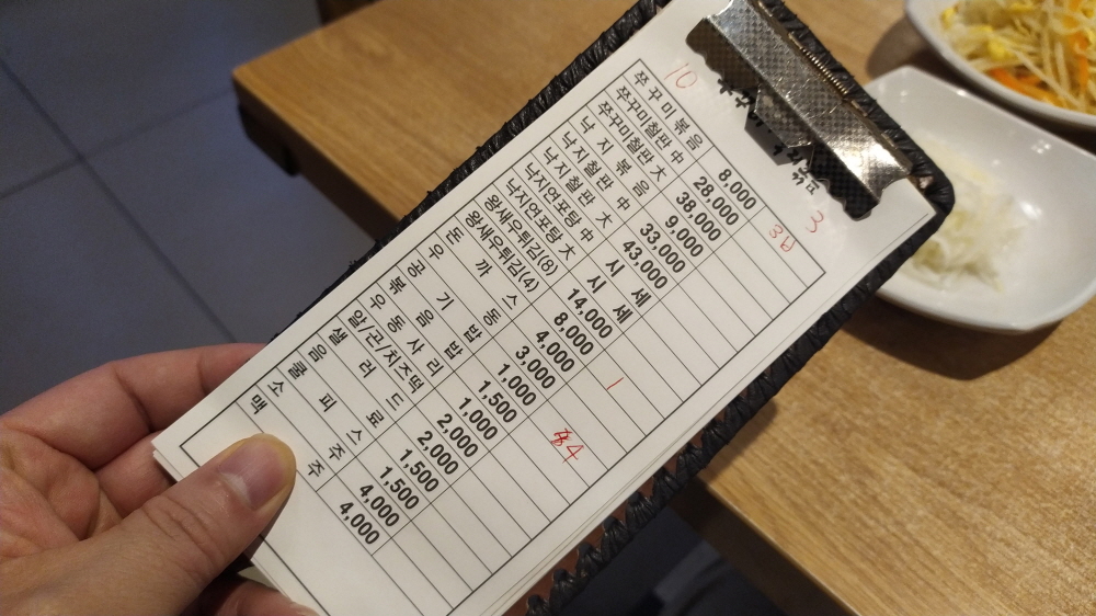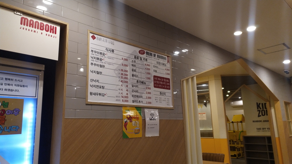 쭈꾸미 1인분 8,000원, 낙지볶음 1인분 9,000원 왕새우튀김 4마리 8,000원 나머지는 사진을 보면 알 수 있다.