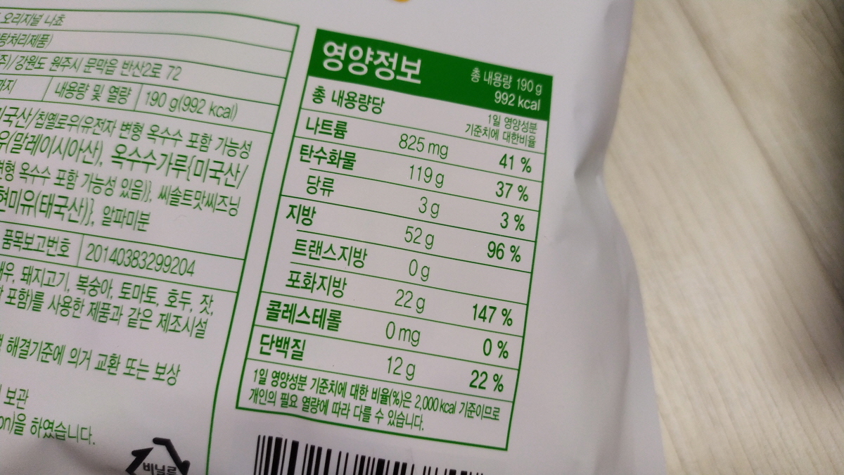 왼쪽 영양정보가 팝콘, 오른쪽이 나쵸 영양정보이다. 똑똑한 소비자가 바른 제품을 만든다!! 꼭 참고하길 바란다.