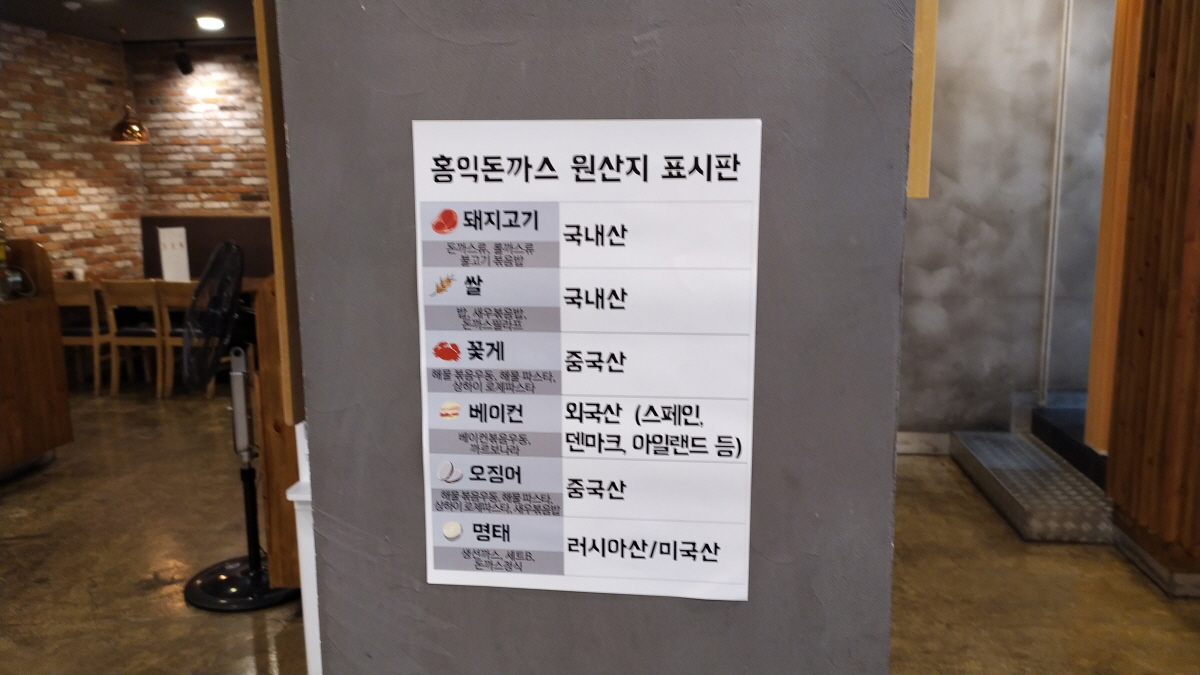 입구에서부터 눈에 잘 보이는 공간에 원산지 표시판이 안내되어 있어 미리 확인하니 너무 믿음직스럽다. 우리 가족은 돈까스 먹으려고 왔는데 돼지고기가 국내산이라 더욱 안심이 된다. 하지만 오늘 홍익돈까스 추천 메뉴로 소문난 음식들(치즈롤 가스 포함) 먹어 보려 한다.