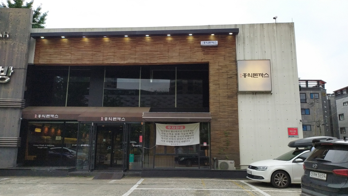 홍익돈까스 매장이다. 참고로 주차공간은 매장 앞 15대 정도 주차할 수 있지만 공간이 없을 경우에는 다소 불편한 느낌도 있을 것이다. 코로나 때문인지 주말임에도 주차공간 여유가 있다.