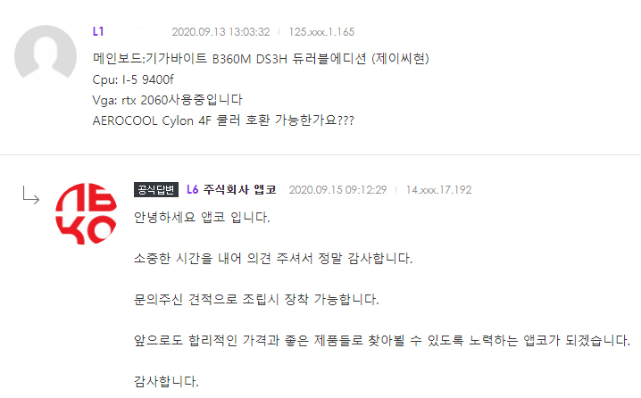 아쉽지만 앱코 컴퓨터 케이스 고객 질문과 답변 게시판 내용처럼 고객응대가 개판이다.