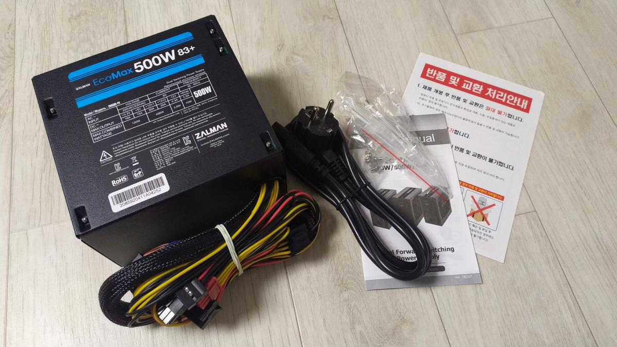필자가 구입한 파워는 잘만제품이며, 정격출력이 500w, 4핀 IDE x3, SATA x4, 6+2핀 PCI-E x2이다. A/S 보증기간은 무상으로 3년!!