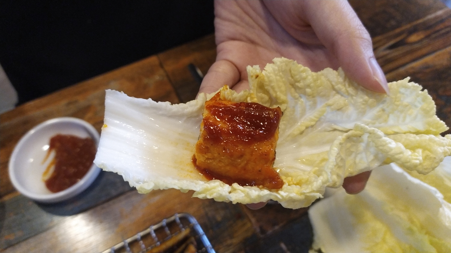 양념소스는 특별한 맛? 은 아니다. 기호에 맞게 맛이 좀 연하게 느껴지면 소스에 찍어먹으면 된다. 옆에 있는 된장은 나중에 나올 아기 속배추? 용이다. 정동진아나고를 좀 더 맛있게 먹는 방법에 사용될 소스가 바로 된장이다.