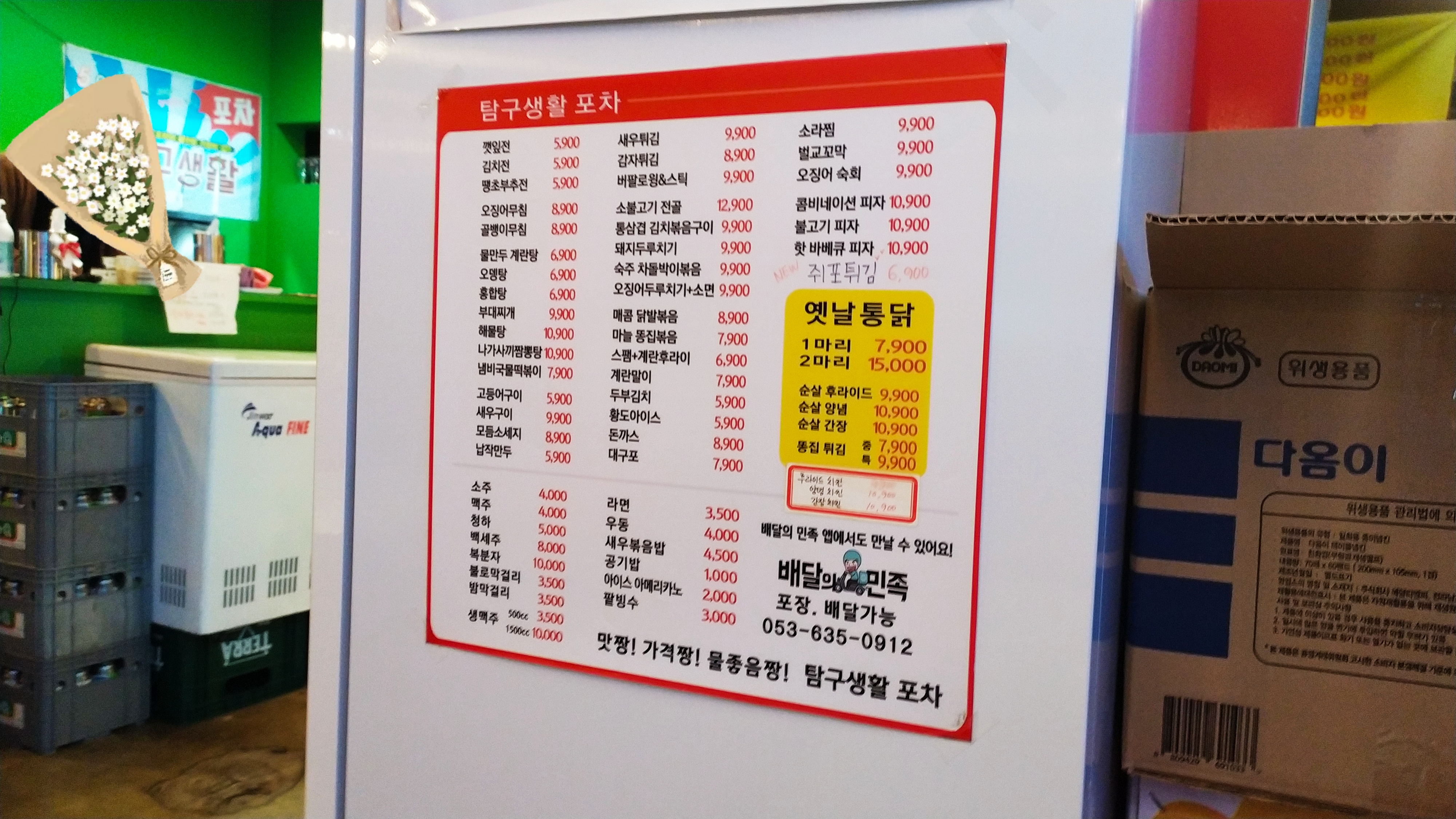 그렇다. 메뉴를 보니 옛날통닭전문점이 아니 포차이다. 이곳은 바로 진천동 탐구생활포차이다. 메뉴가 많아도 너무 많지만 우린 옛날통닭 현수막보고 입장한 것이니 옛날통닭 주문한다.