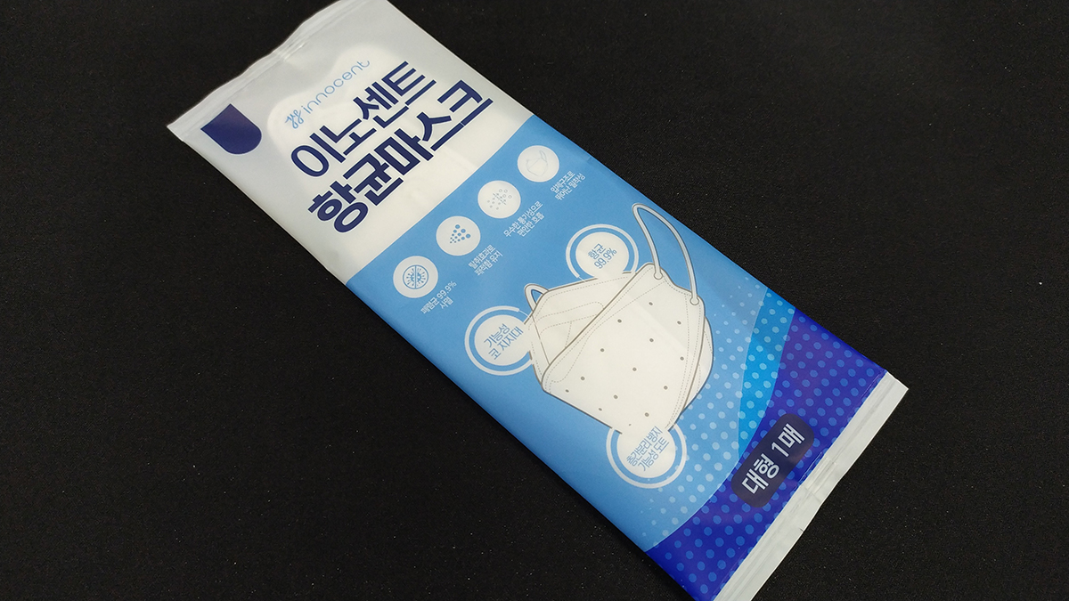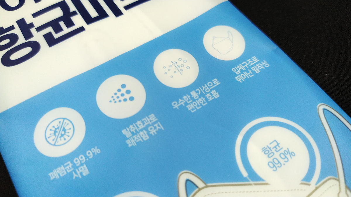 폐렴균 99.9% 사멸, 탈취효과로 쾌적함 유지, 우수한 통기성으로 편안한 호흡, 입체구조로 뛰어난 밀착성이라는 문구가 마스크 포장지에 새겨져 있네요.