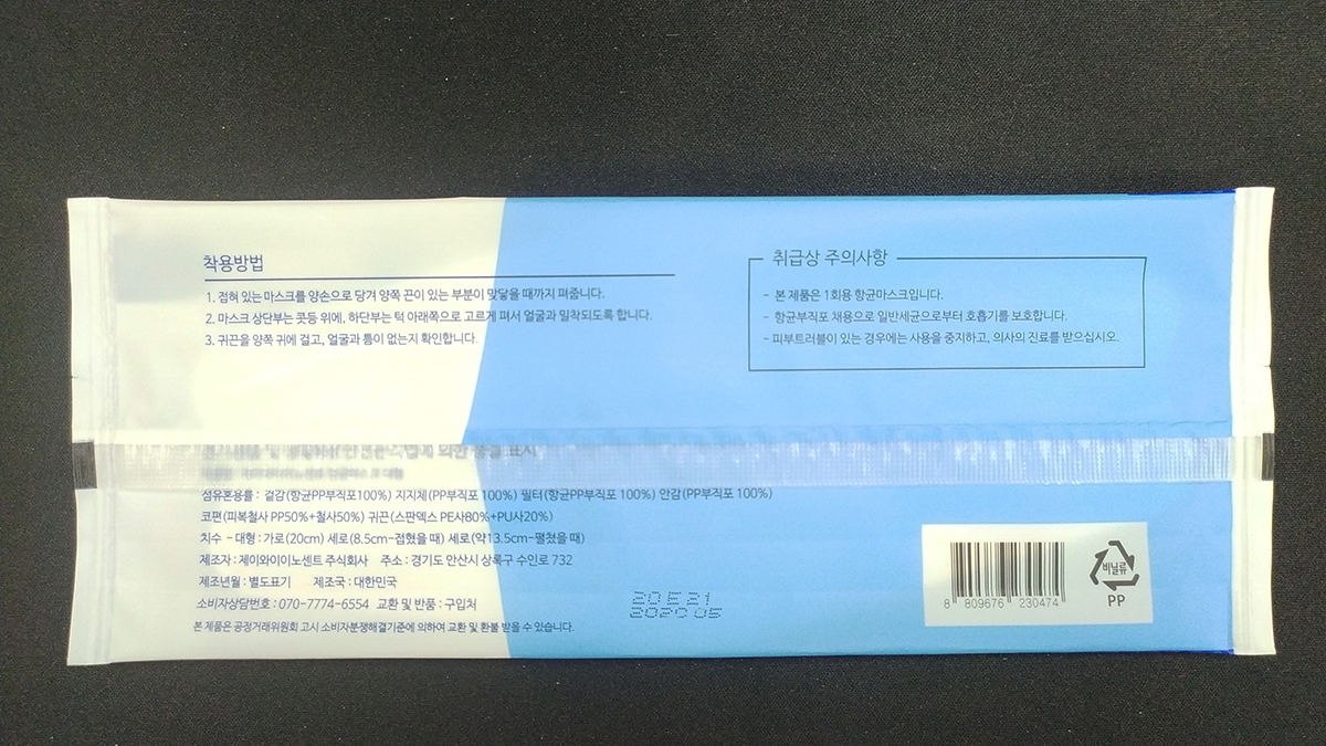 개별 포장지 뒷면에도 마스크 착용방법은 물론 마스크 섬유 혼용률까지 아주 자세히 기재되어 있다.