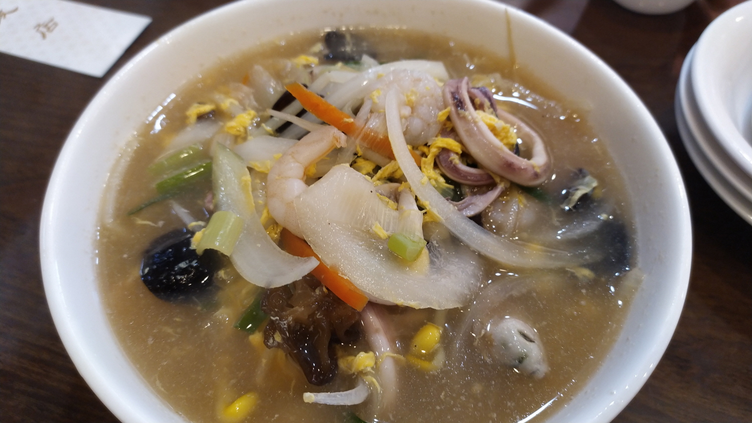 가장 먼저 우동이다. 내용물은 짬뽕보다 훨~ 많이 들어간 느낌 같지만 막상 먹어보니 비슷하다. 그리고 맛 역시 짬뽕과 비교하면 매운맛을 뺀 말 그대로 덜 매운 짬뽕으로 결론 내린다. 하지만 맛의 기본은 잘 지켜서 인지 누구나 먹어도 부담 없는 맛을 보여줄 듯하다. 생각보다 국물의 끝 맛은 알 찬 얼큰함을 보여준다.
