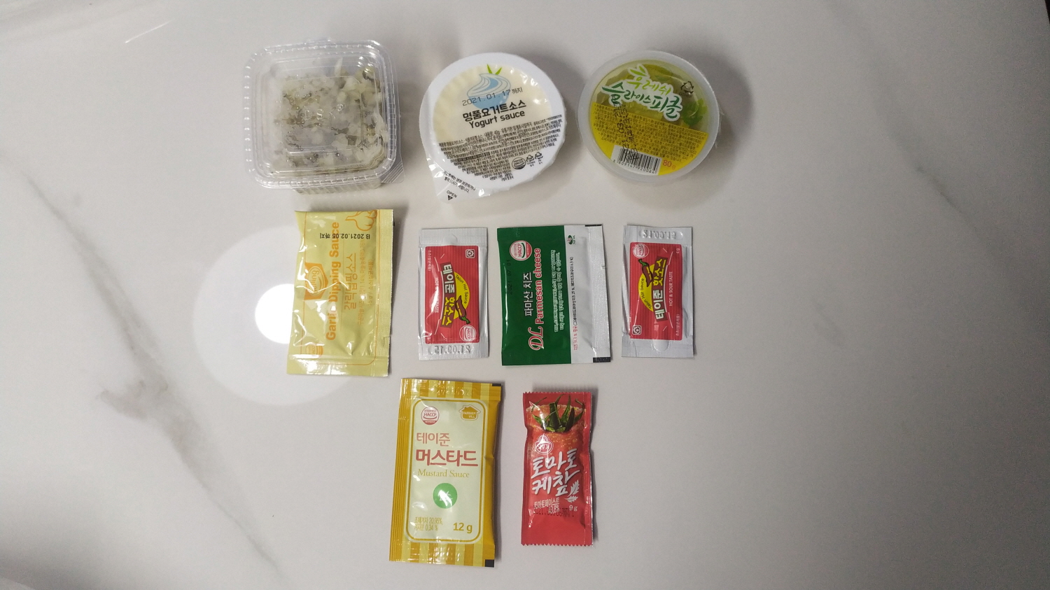 일반적인 배달 피자보다 몇 가지 더 주는 느낌이다. 처음에는 밥?인 줄~ 양파 샐러드이다. 나머진 토마토케첩, 머스터드, 핫소스, 요구르트 소스, 피클, 갈릭소스, 파마산 치즈 그리고 포크까지 넣어준다.