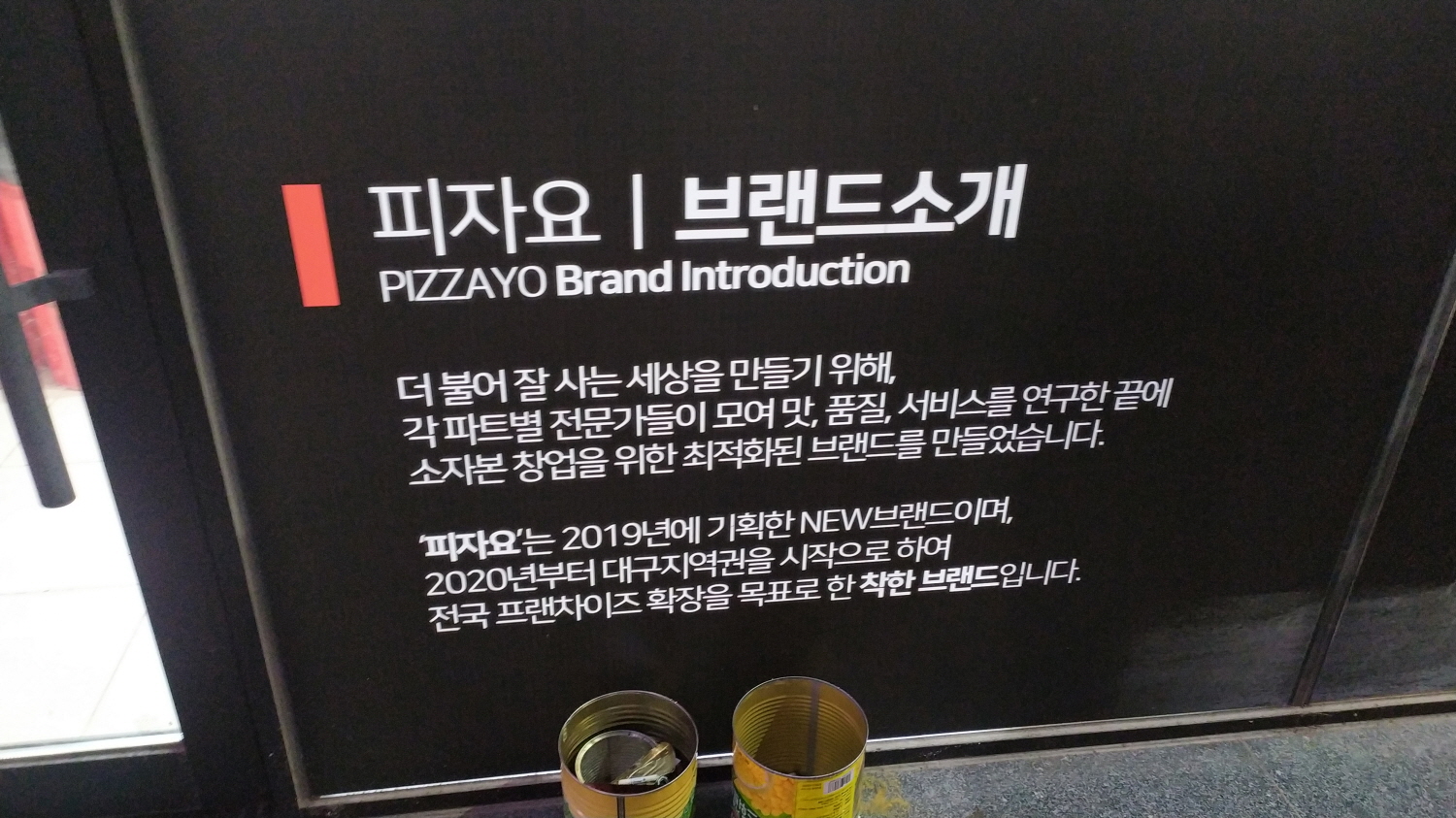 소자본 창업을 위한 최적화된 브랜드, '피자요'는 2020년부터 대구 지역권을 시작으로 하여 전국 프랜차이즈 확장을 목표로 한 착한 브랜드라는 문구가 매장 입구에 기재되어있다.