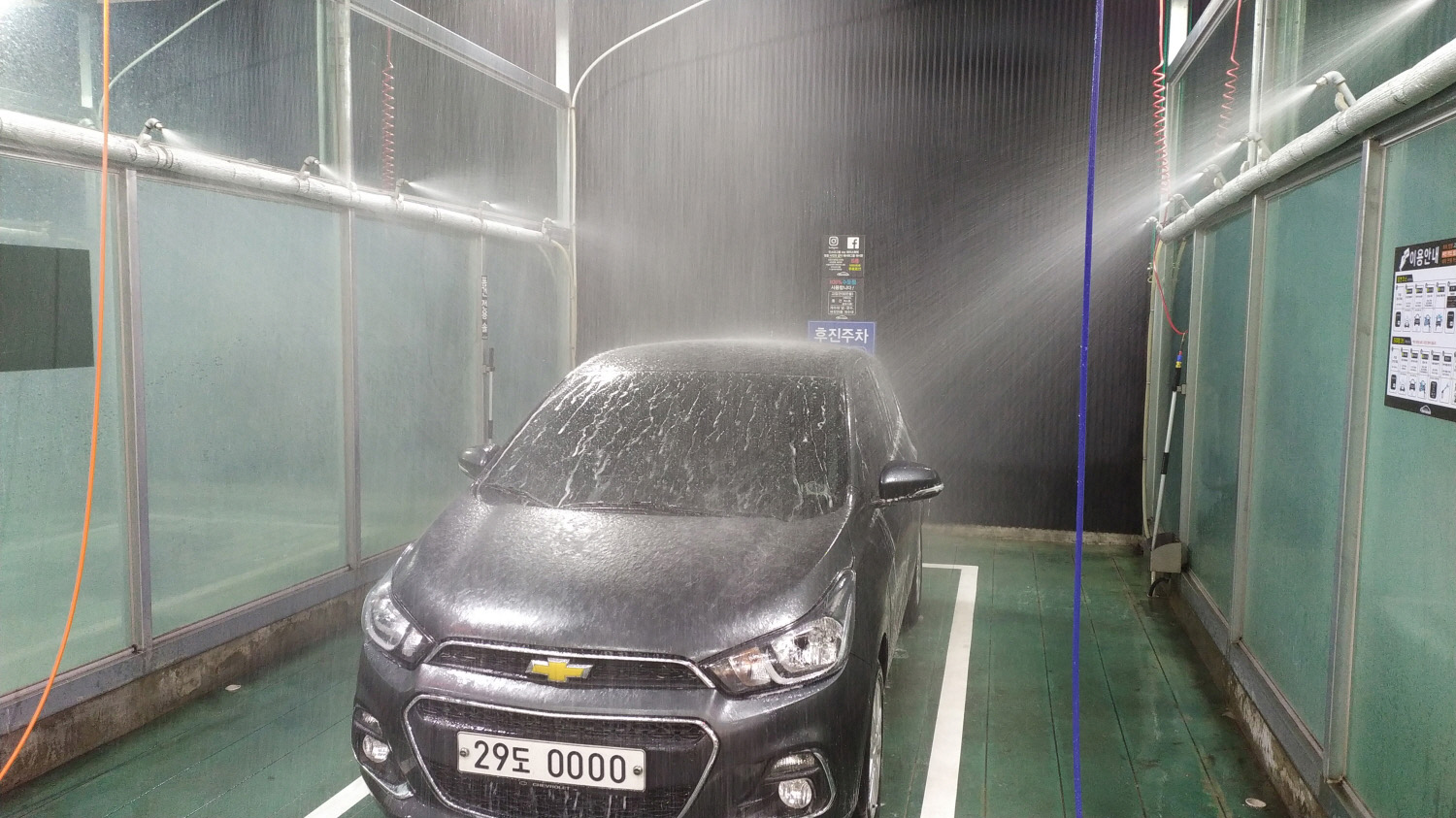 손세차를 위해 아시는 분과 함께 세차를 시작한다. 각자의 차량을 게이트에 넣고 셀프세차장 이용방법을 잠깐 읽어본다. 세차장 바닥에 흰색 실선이 보인다. 그 안쪽에 차량을 넣어주는 것이 좋다. 만약 하부 세차를 한다면 아래쪽에서 물이 나오기 때문에 가능한 실선에 맞혀 차량을 주차하는 걸 추천한다.