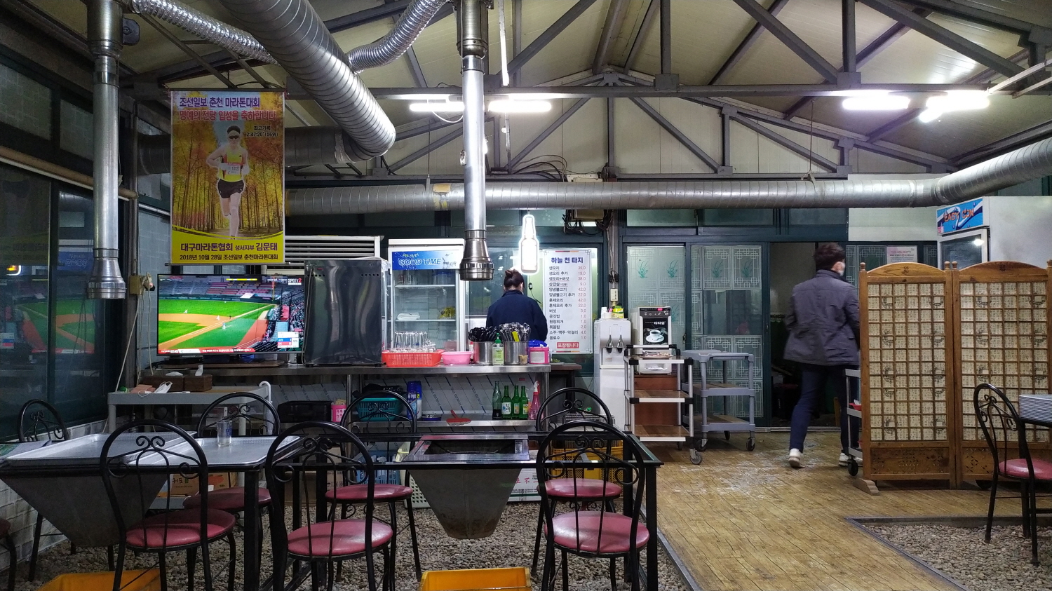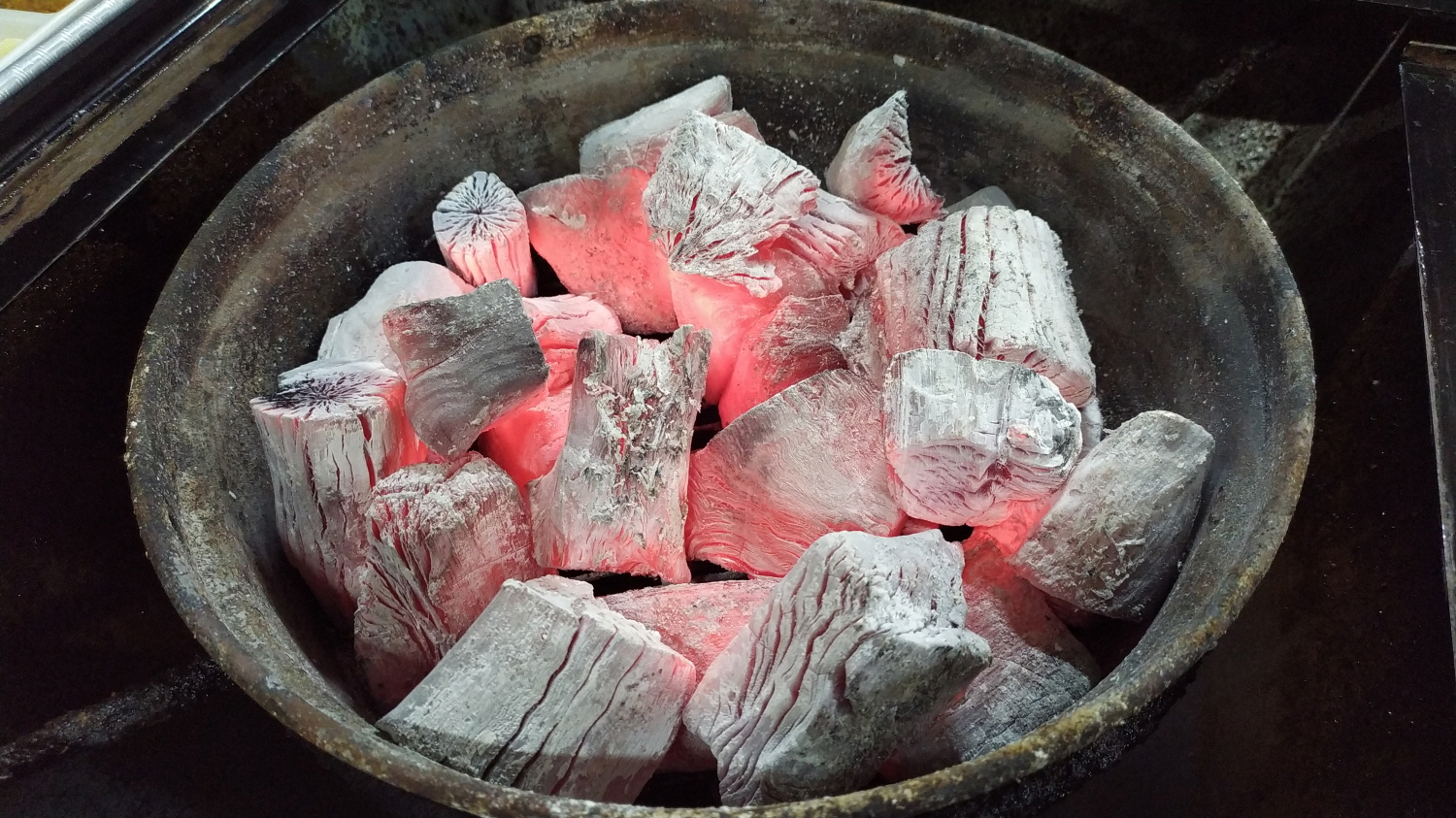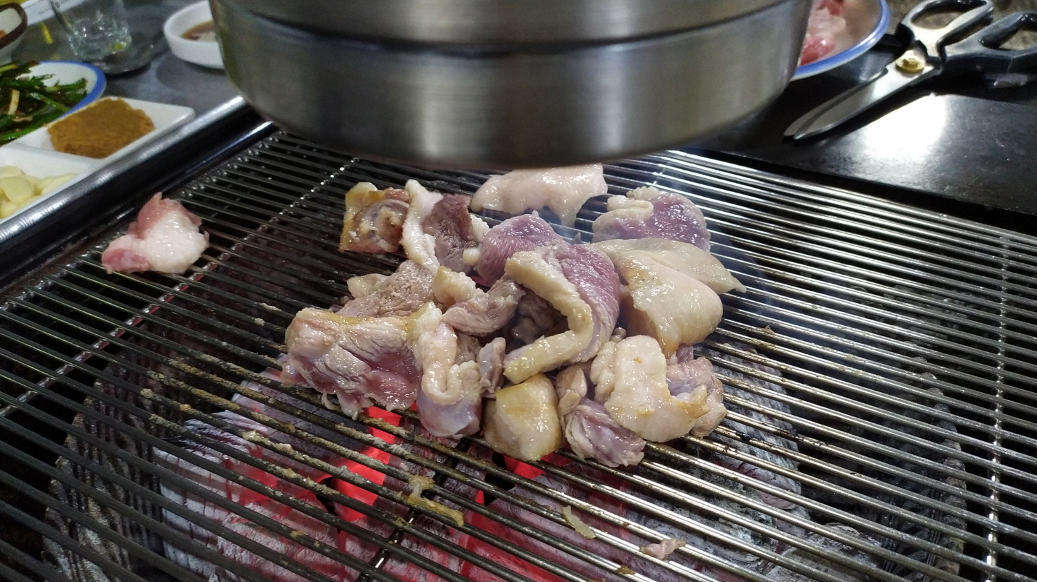 밑반찬들 모두 세팅이 되고 바로 이어 숯불이 세팅된다. 10월 하수인데 초겨울 같다. 숯불이 이렇게 반갑게 느껴지니 겨울이 다가오고 있긴 하나 보다.