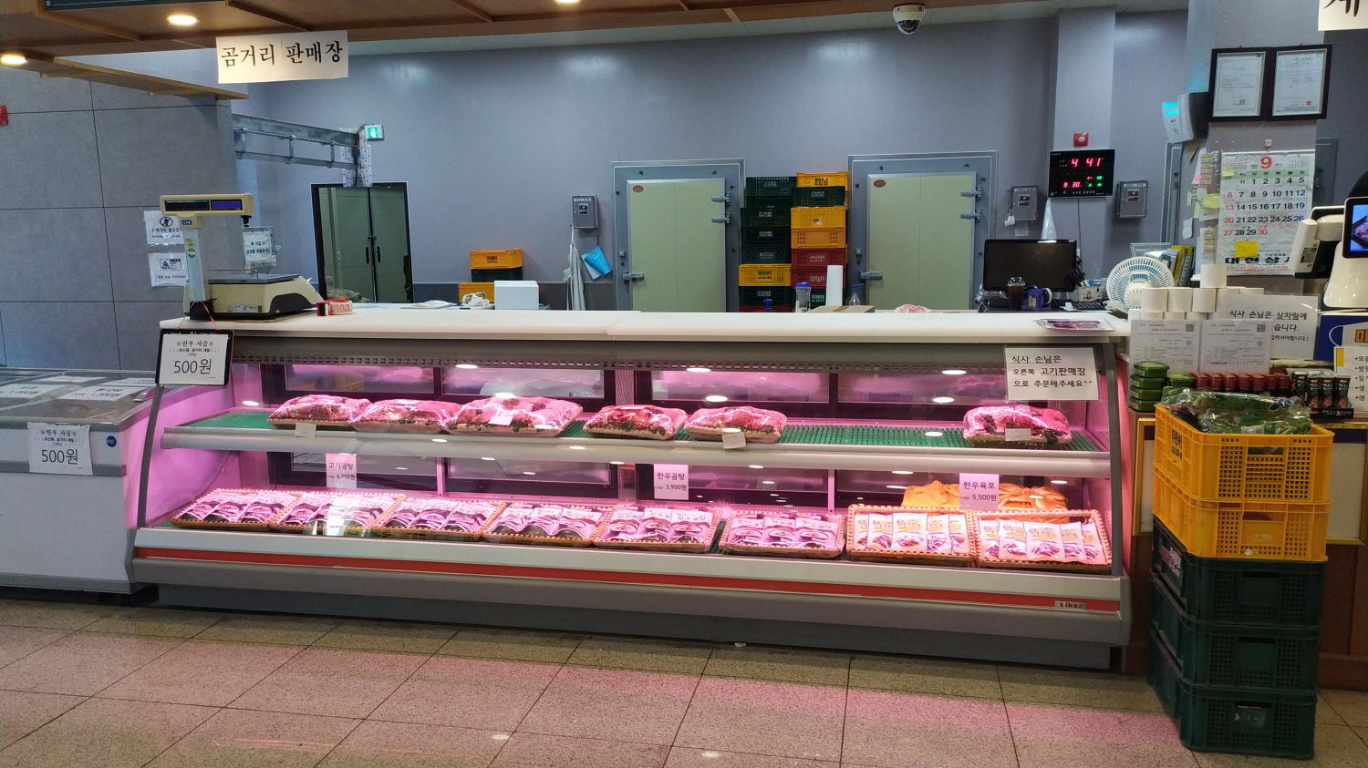 오른쪽 한우 판매장, 이곳에서 소고기를 구입한다.