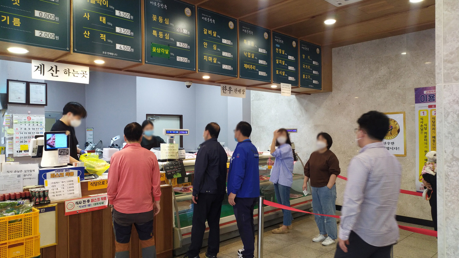 요즘 어딜 가나 마스크 착용은 물론 입구에서는 열 체크를 한다. 이제 습관이 되어하지 않으면 더 이상하다. 온도 체크를 하고 왼쪽에 마련된 식육점에서 소고기를 구입해야 한다.