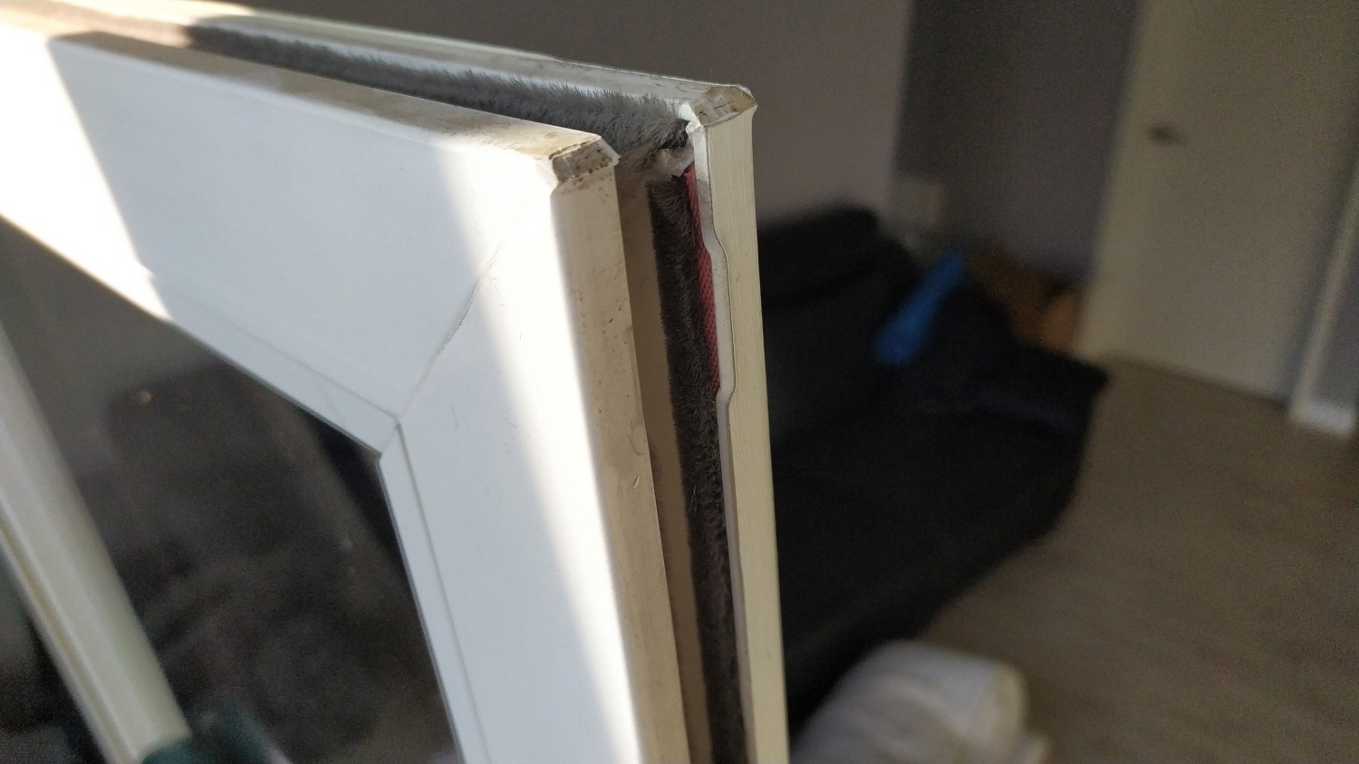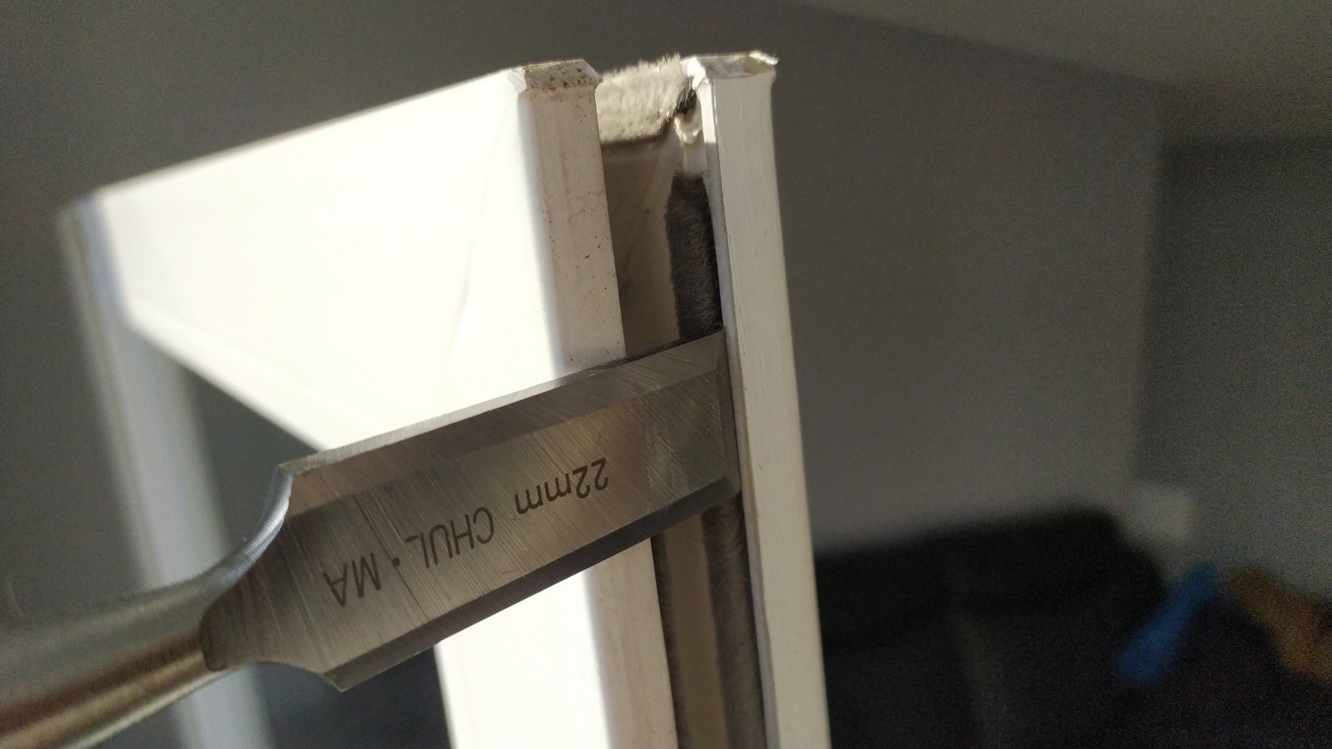 예상대로 시작 부분에서는 잘 들어간다. 하지만 넣기가 쉽지가 않다. 들어가더라도 모헤어가 샷시 틈에 딱 맞게 들어가지 못한다. 들어가더라도 아주 작은 사이즈에 화장실 창틀 반 정도 들어가서는 더 이상 집어넣기가 힘들어진다. 결국 이 방법은 포기하기로 한다.