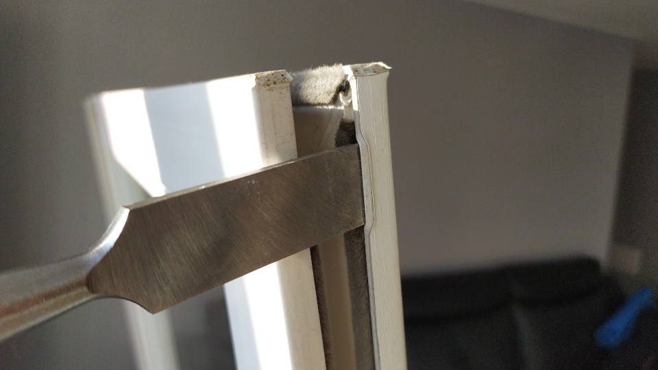 목공용 수공구를 이용하면 아주 편하게 작업의 속도 올릴 수가 있다. 기존에 달려있는 모헤어 틈에다 목공용 수공구를 집어넣고 헤어 드라이기를 사용하여 열을 가해준다. 사진처럼 창틀이 살짝 벌어지면서 들리게 된다.